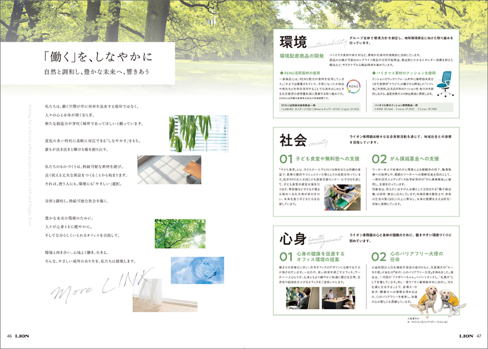 巻頭の特集ページでは、当社のサステナビリティに関する取り組みをピックアップ。“「働く」を、しなやかに”をテーマに、環境配慮商品の開発や、社会貢献活動についてご紹介しています。
