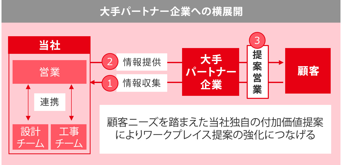 特に、株式会社大塚商会との協業で培ったスキームを活用し、他の大手パートナー企業の顧客に対してオフィス家具を共同提案するなど、安定的な収益を確保できる仕組みを構築しています。加えて、法人ユーザーの新規開拓にも注力し、直接販売の強化を図っています。