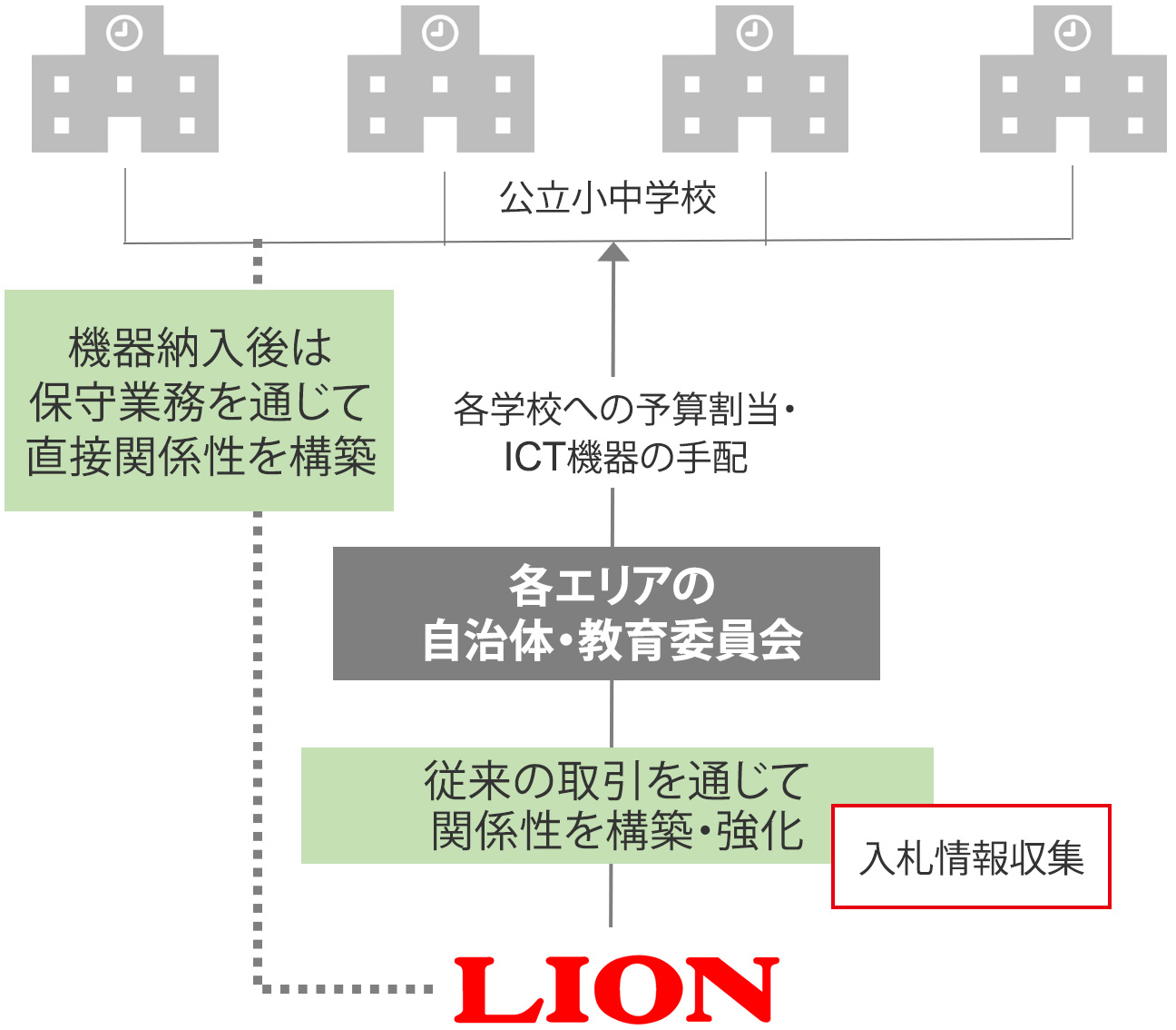 自治体や教育委員会を通じて、主に公立小中学校向けにICT機器(電子黒板・プロジェクタなど)や保守サービスを提供しています。