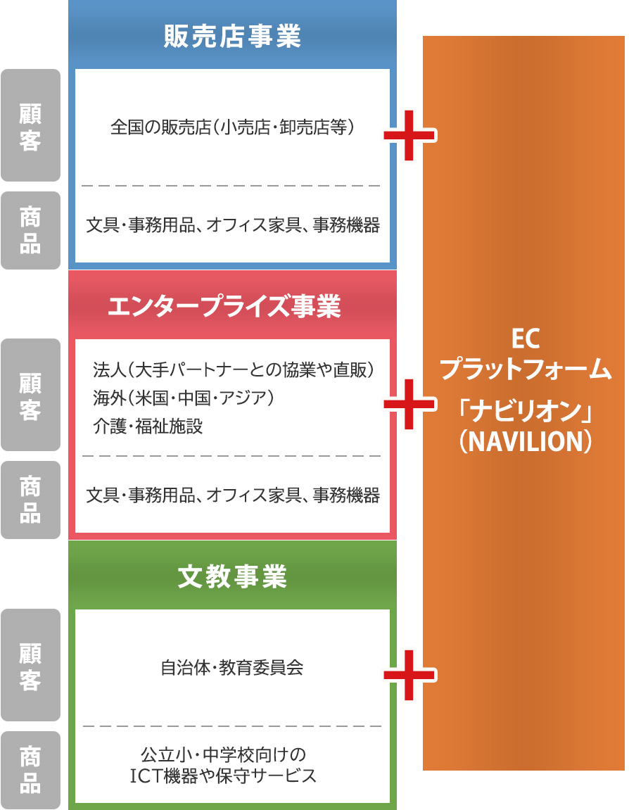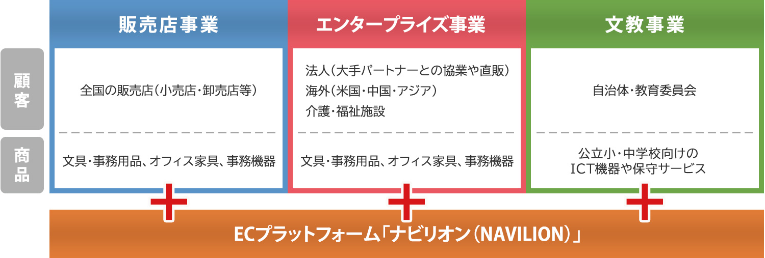 異業種の大手パートナー企業との協業や法人ユーザーとの直接取引、さらに介護・福祉市場や海外市場向けの取引等を通じて、文具・事務用品、オフィス家具、事務機器などの多様な商品を提供しています。