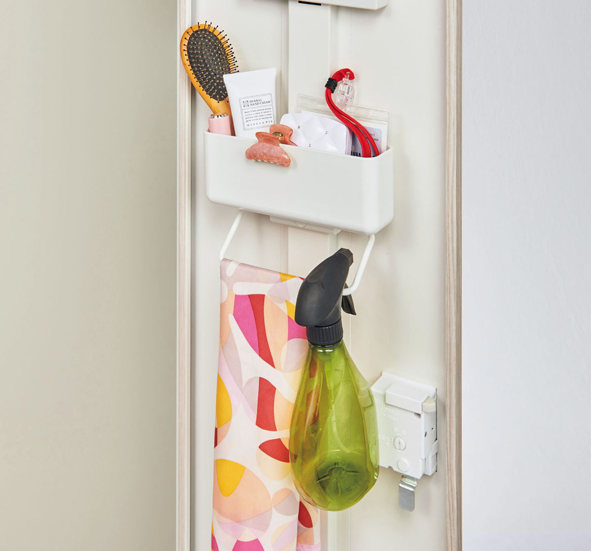 着替え時に取り外すものや、ブラシなどの身だしなみ用品を入れておけます。下のフレームにはスプレーボトルなどを引っ掛けられます。