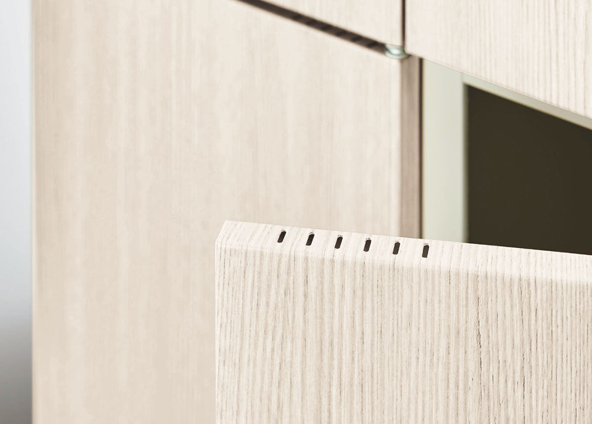 扉の上部と下部見込面にエアホールを設けました。庫内の空気を循環させ、匂いのこもりを解消します。