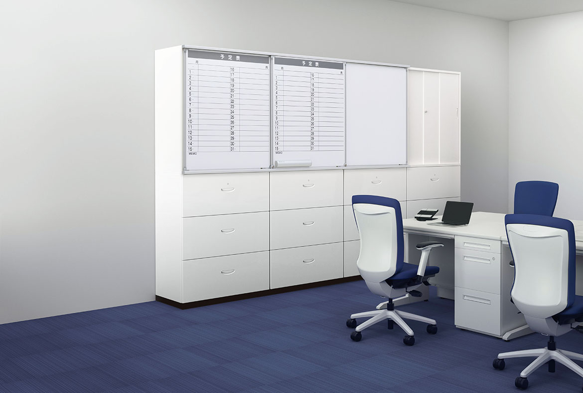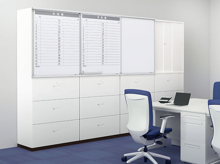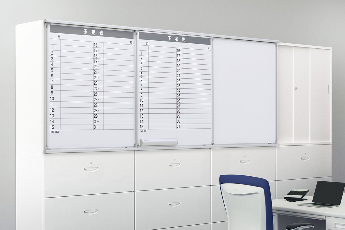 壁面の限られたスペースを有効利用。H750・H1050mmのオープン型・引戸型にはスライドボードが取付可能です。