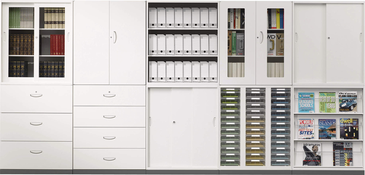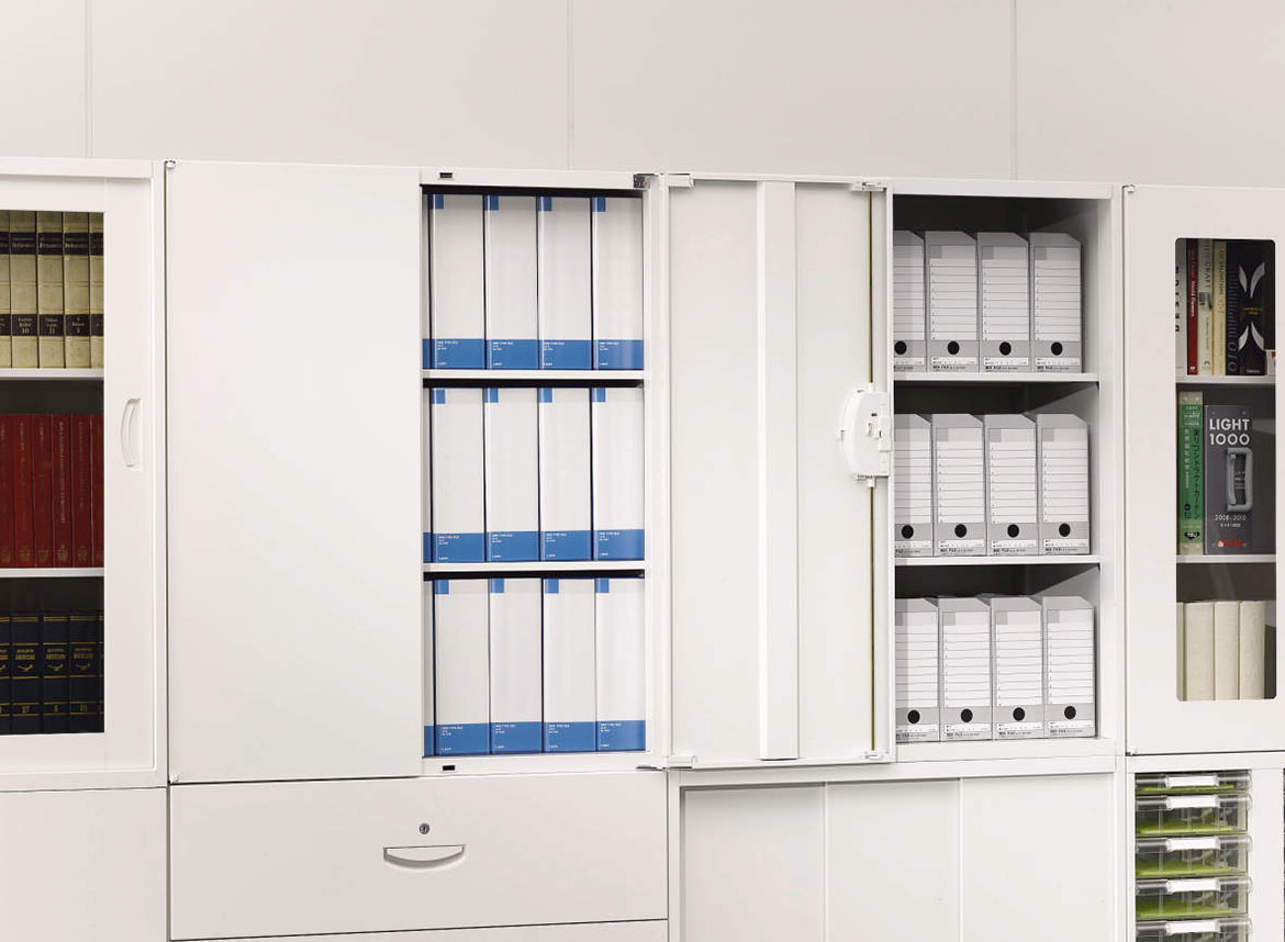 開き扉は180度開口し、通路を邪魔することなく、書類などの収納物を出し入れできます。