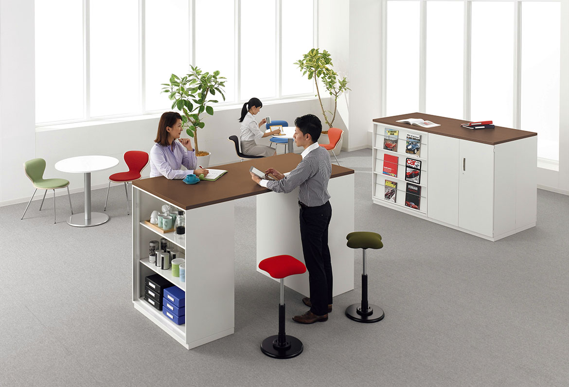 リフレッシュスペースを創り出すユニットです。豊富なバリエーションの収納ユニットを大型天板でつないで、カウンターテーブルを構成します。