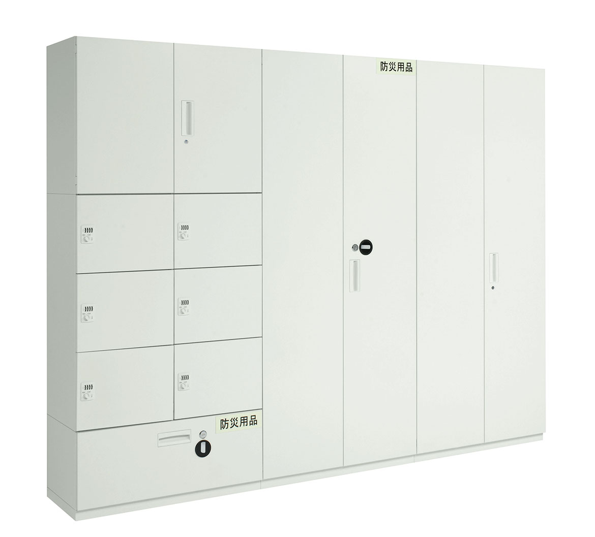 防災用品を収納するユニットです。緊急時、カギがなくても開けられる非常時解錠窓枠仕様。防災用品表示は、停電消灯時に自己発光する蓄光仕様です。