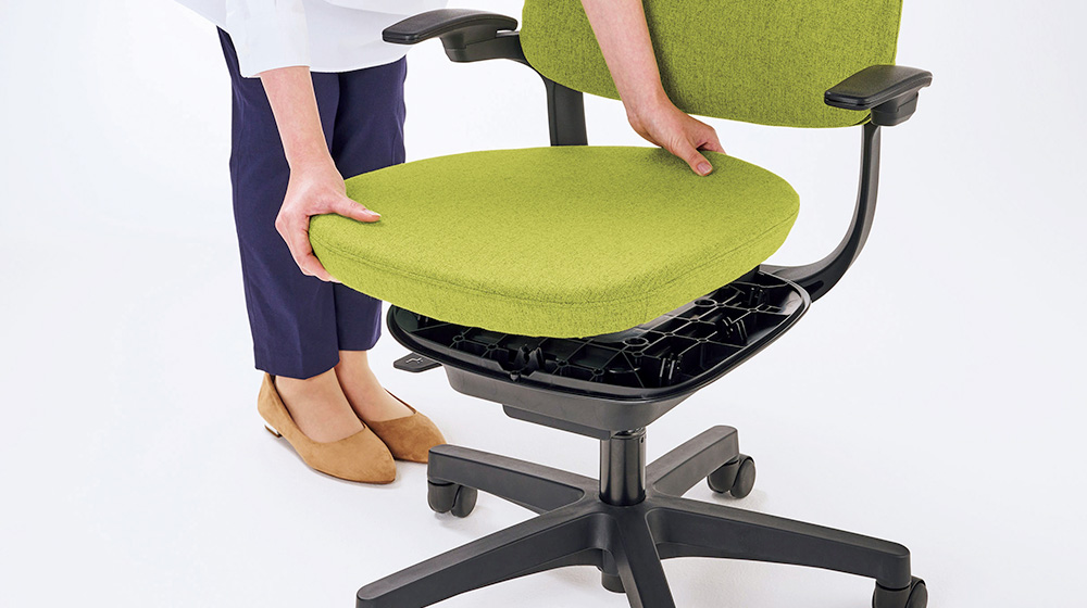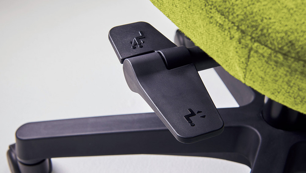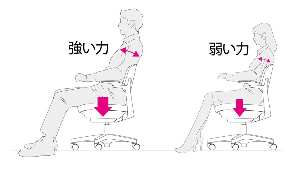座面にかかる荷重に応じて、背もたれの反力が変化するセルフアジャストロッキング機構の採用により、大柄な方にも小柄な方にも、面倒な操作をすることなく、快適な座り心地を提供します。ロッキング時に座面の持ち上がりが少ない独自の機構が、ストレスのない自然な動きでオフィスワーカーをサポート。フロントストッパーを使えば、アップライトな姿勢の保持も可能です。