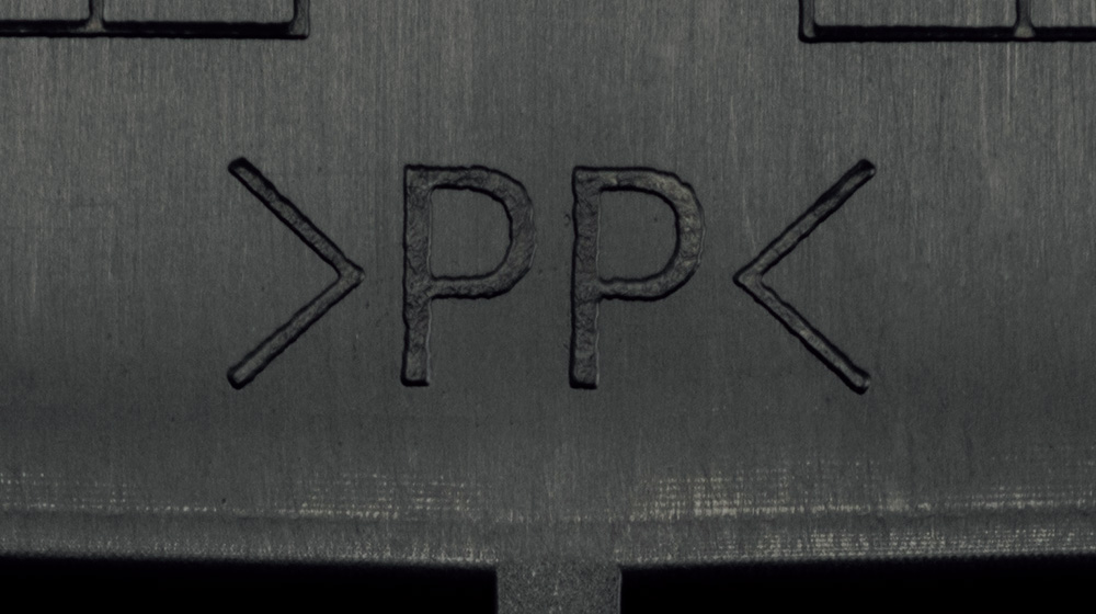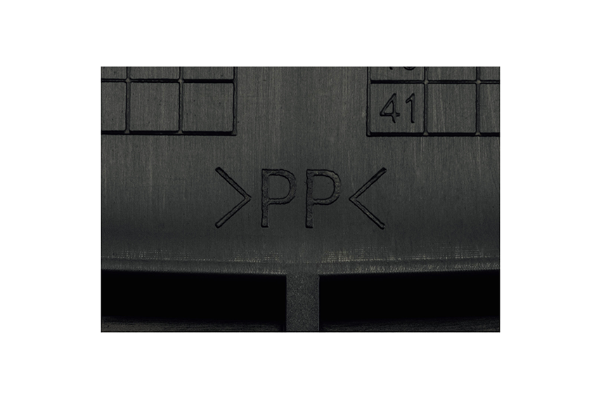 主要な樹脂パーツに素材名を表示し、廃棄時の分別処理や再利用の推進に配慮しています。