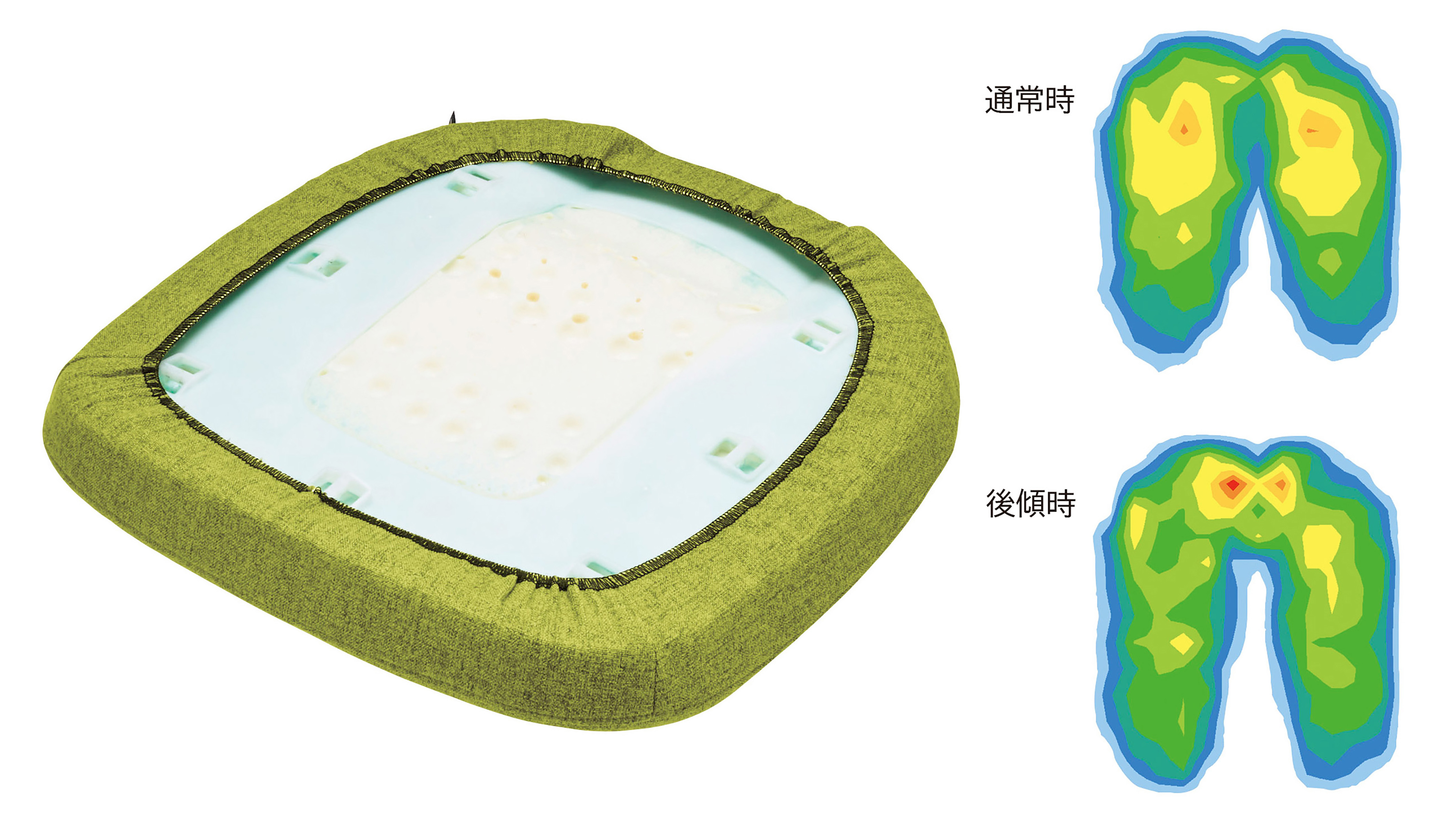 独自の座面クッション構造により着座時の理想的な体圧分散を実現しました。適切な位置に適切なサイズで配置されたマルチホール構造により、座骨周辺や大腿部を適切に減圧して骨盤をしっかりと支え、穴が設けられていない部分が臀部の前すべりを防止。あらゆるポジションで快適で安定した姿勢を保ちます。