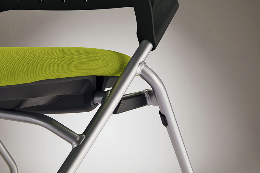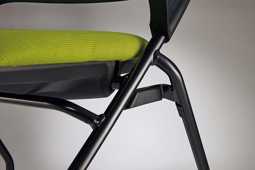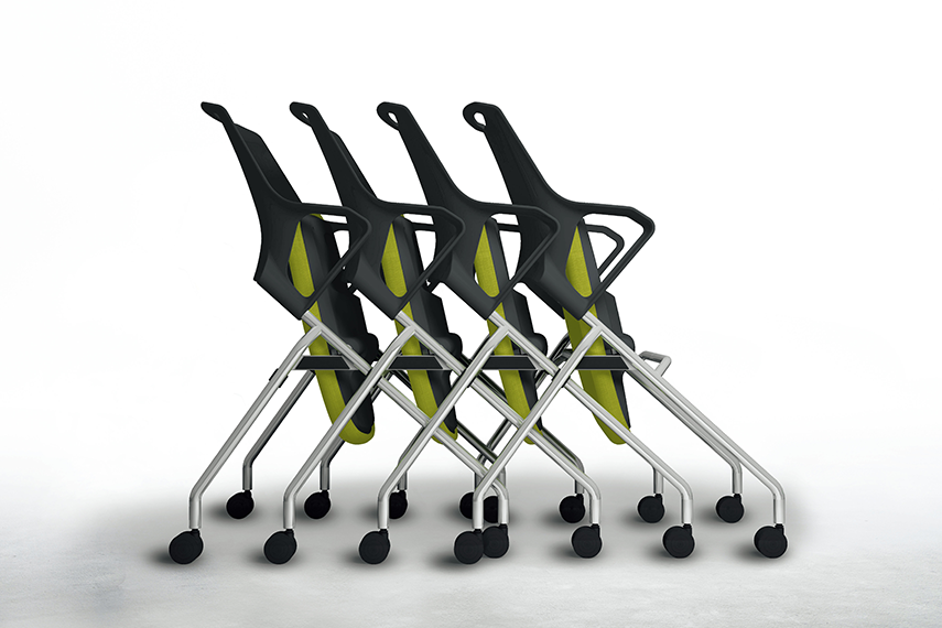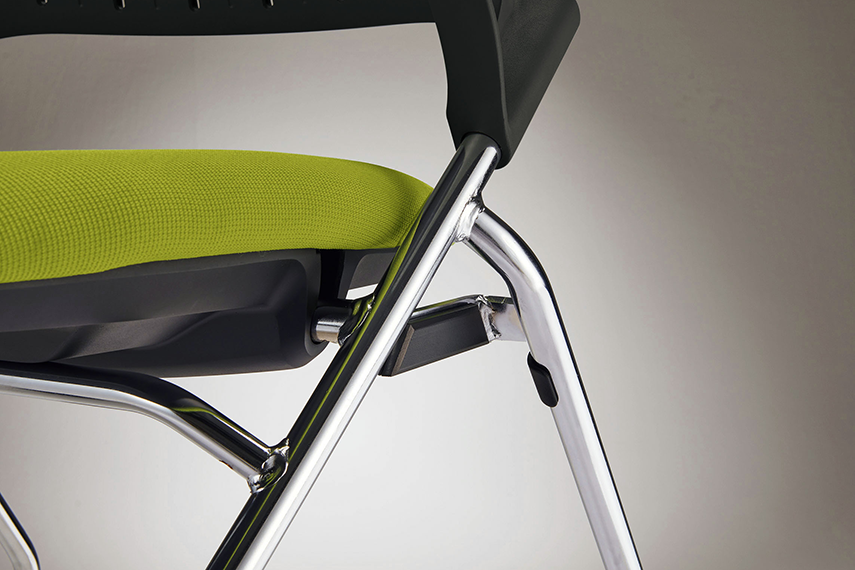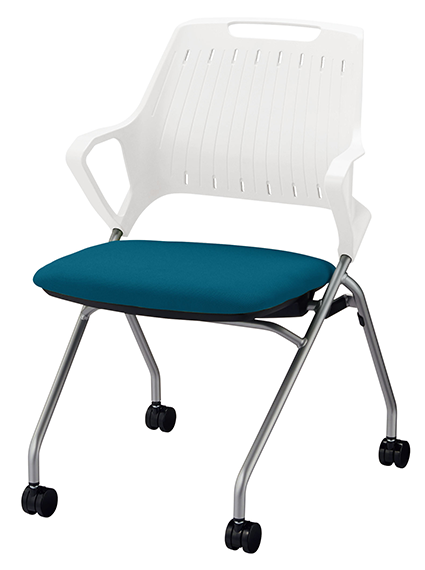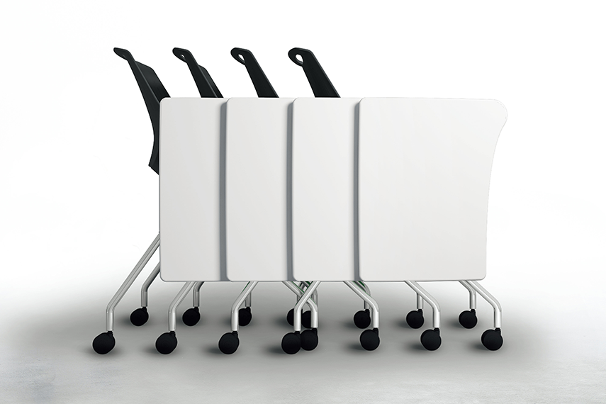 スライドスタッキングタイプは、座面を跳ね上げ、カートのように水平方向に収納します。