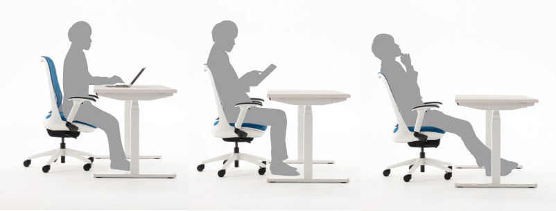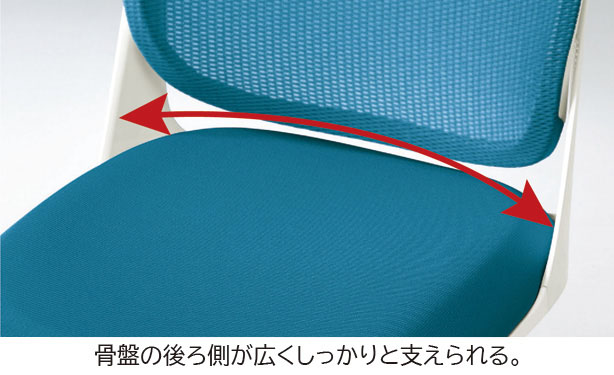 骨盤がしっかりとホールドされており、体幹が安定した状態で保たれることから、前方への重心移動が容易で、特に前傾姿勢を主とする机上作業に適しています。また、スイングスライド機構によりもたらされるロッキング運動は、低負荷で長時間持続可能であるため、年齢や体格の違いによらず、多くのワーカーに適するとともに、以下のような効果が期待できると考えられます。