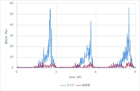 従来チェアーのロッキング時に比べ、ライドで揺れるときには、「第二の心臓」とも呼ばれる「ふくらはぎ(腓腹筋)」が働き、足のむくみ軽減につながる体液量調節の効果が期待できます。
