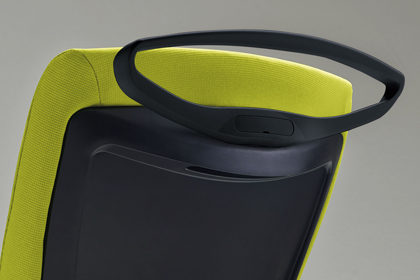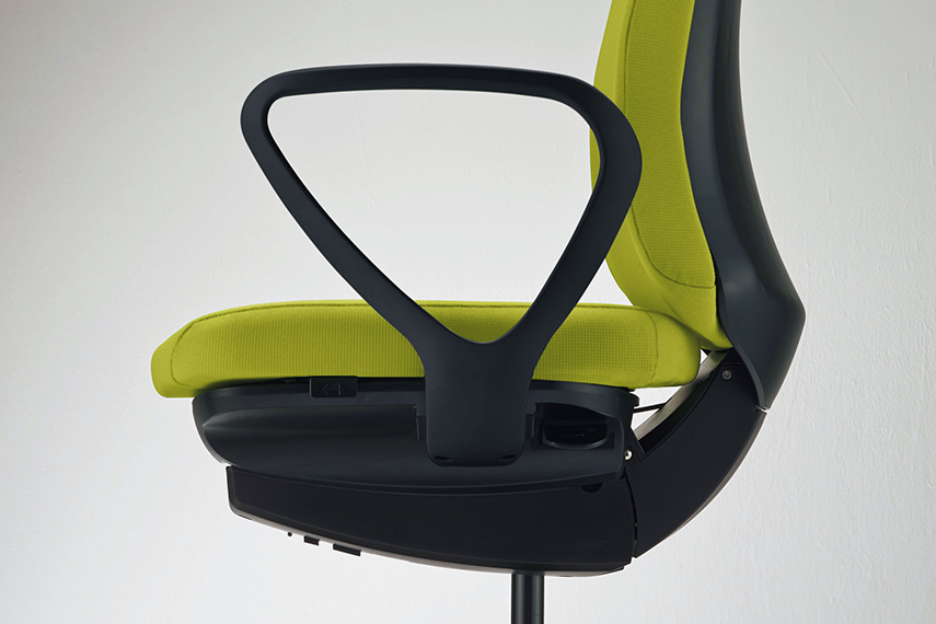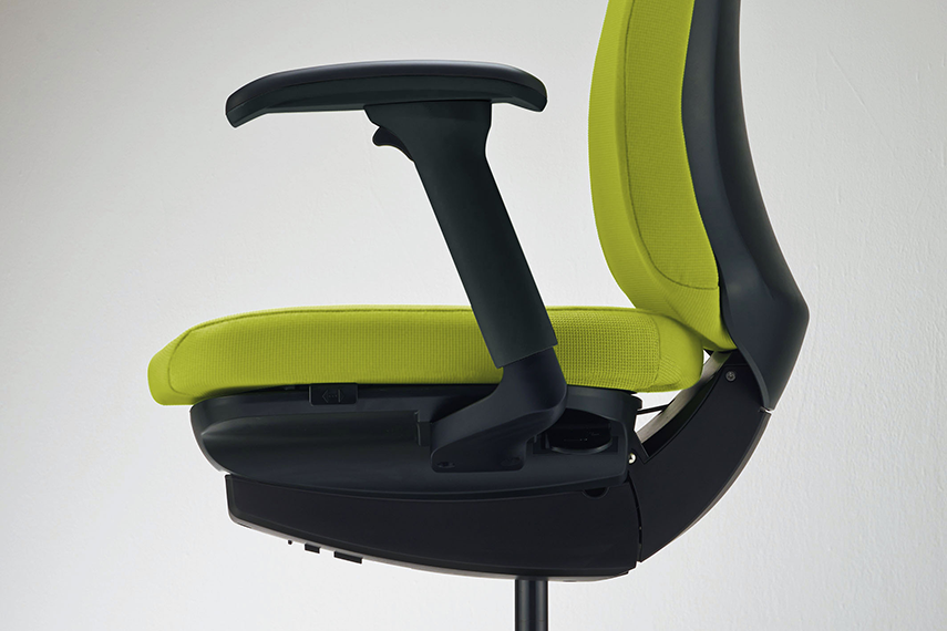 座面右下(中央)の調節ツマミの操作により、背のロッキング反力の強弱を簡単に調節できます。座面右下(前方)のレバーを持ち上げると座面の高さが調節できます。(ストローク:90mm)