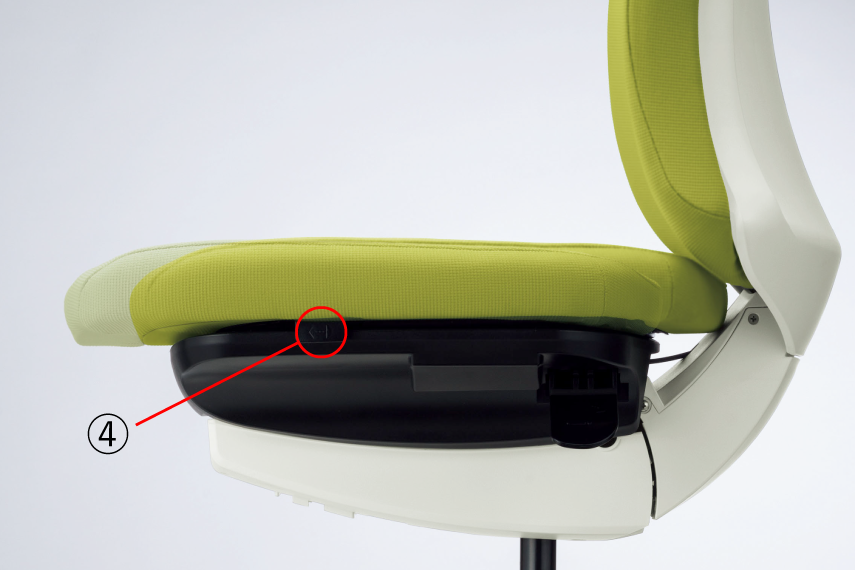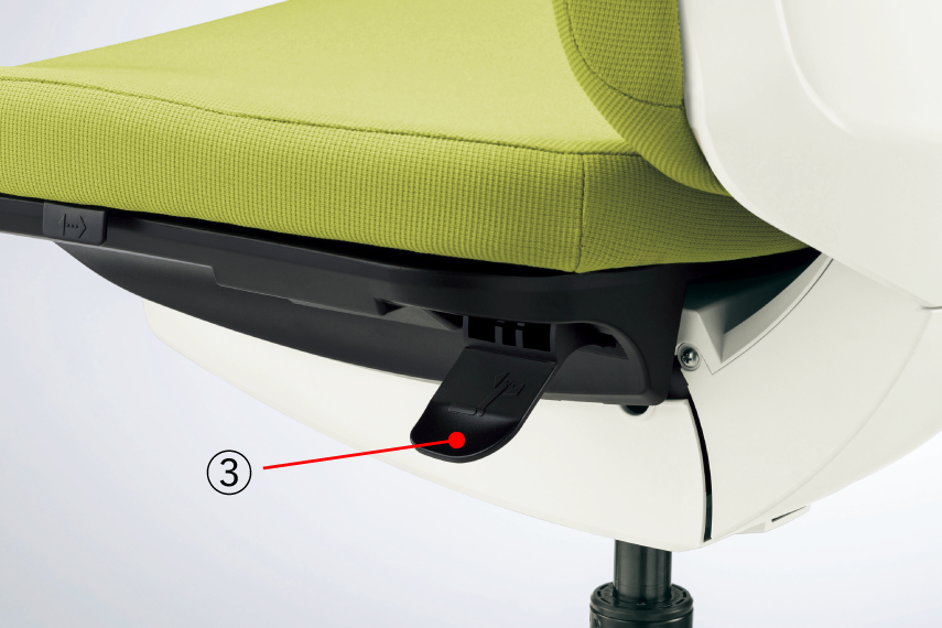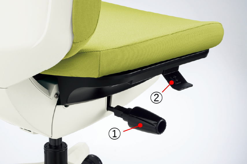 座面左下(前方)のレバー操作により、座面の奥行きが調節できます。(前後50mm、6ポジション)