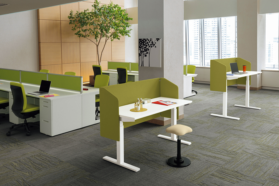 執務スペースサイドの共用デスクとして個人の体格差や使用時の姿勢に合わせて自由に調節ができるデスク。
