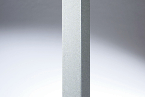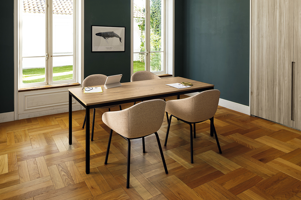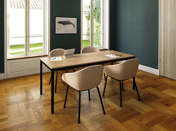 洗練された細身の脚フレーム。チェアーを収めやすい広めの脚間もポイント。天板はクリーンなホワイト、グレイッシュな木目の2色展開。