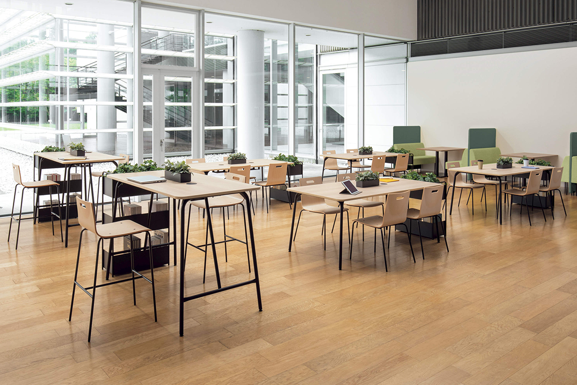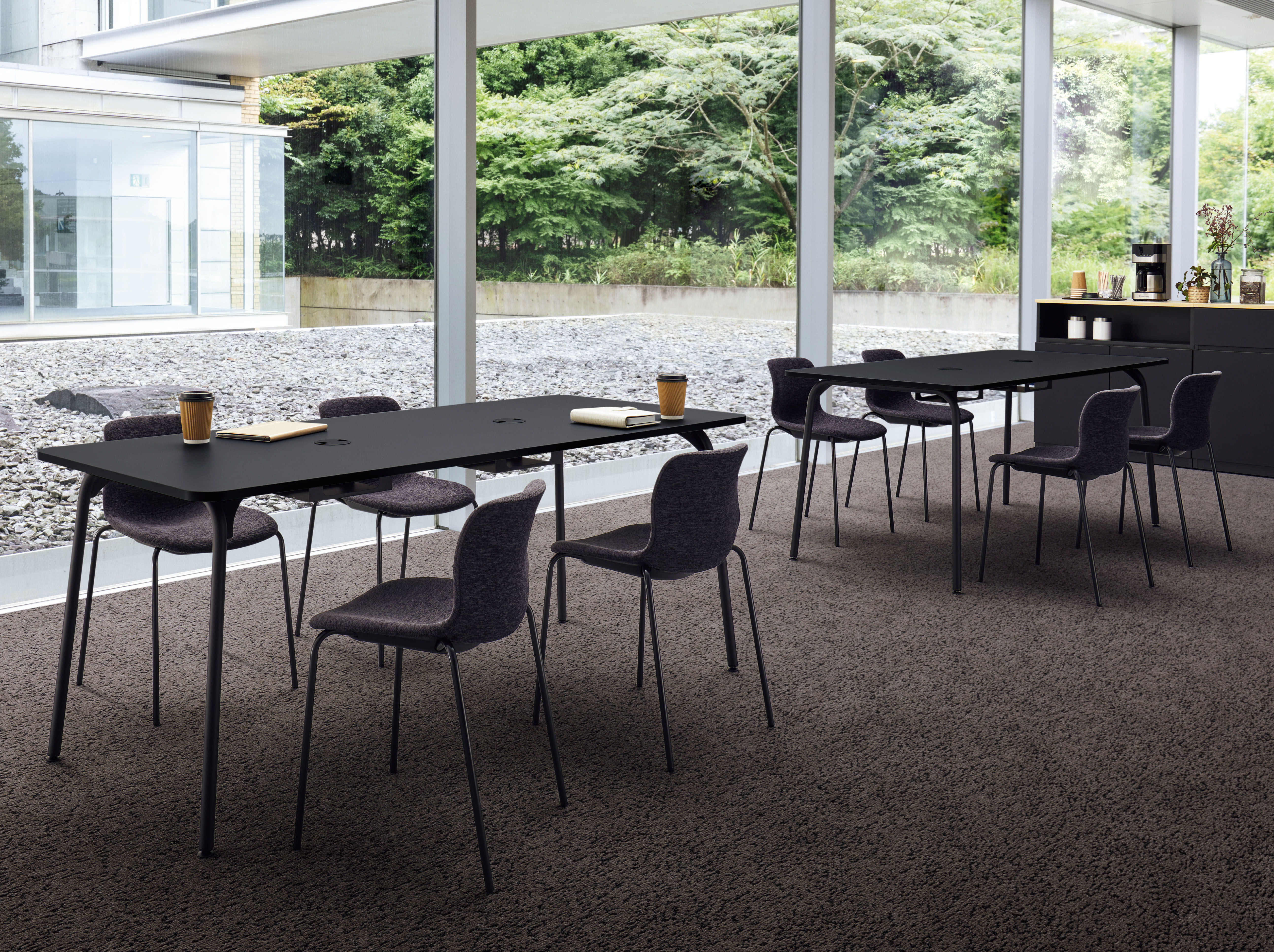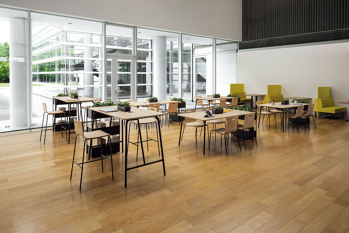 角を大きくとった天板と斜めに伸びた細身のパイプ脚が優しさを感じさせ、リラックスした空間を演出します。
