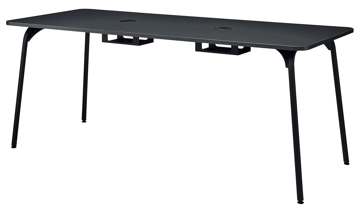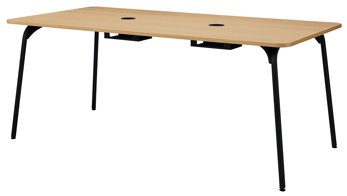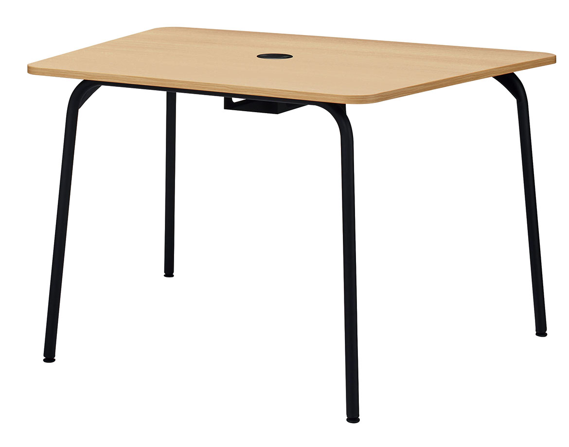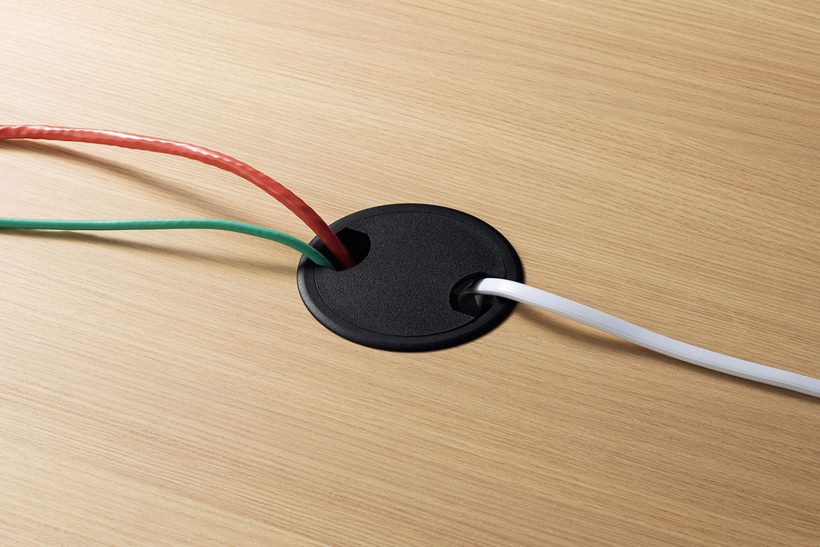 配線孔は、天板を広々と使える小型の円形状。回転するため、どの席からでもアクセスしやすくなっています。