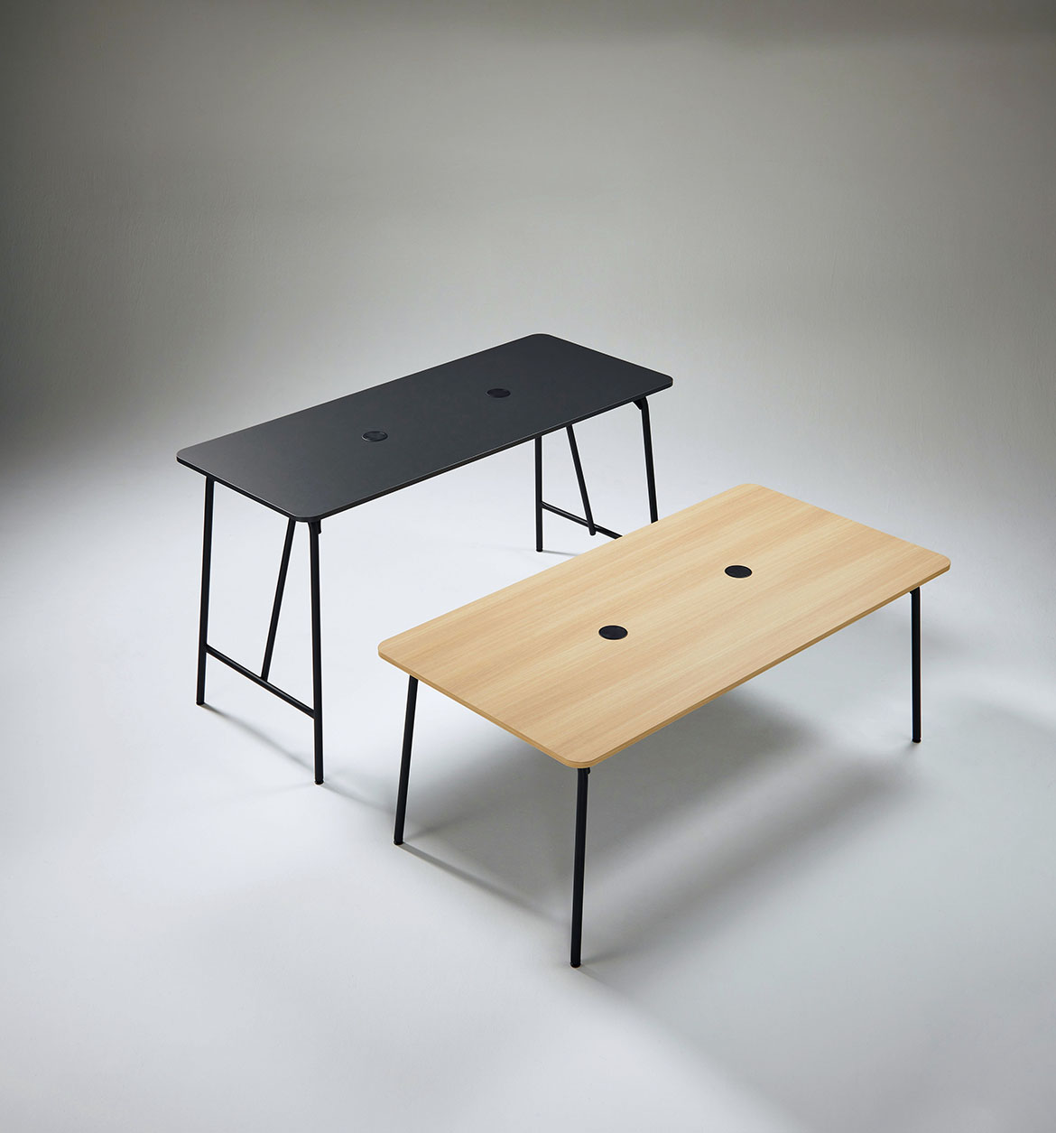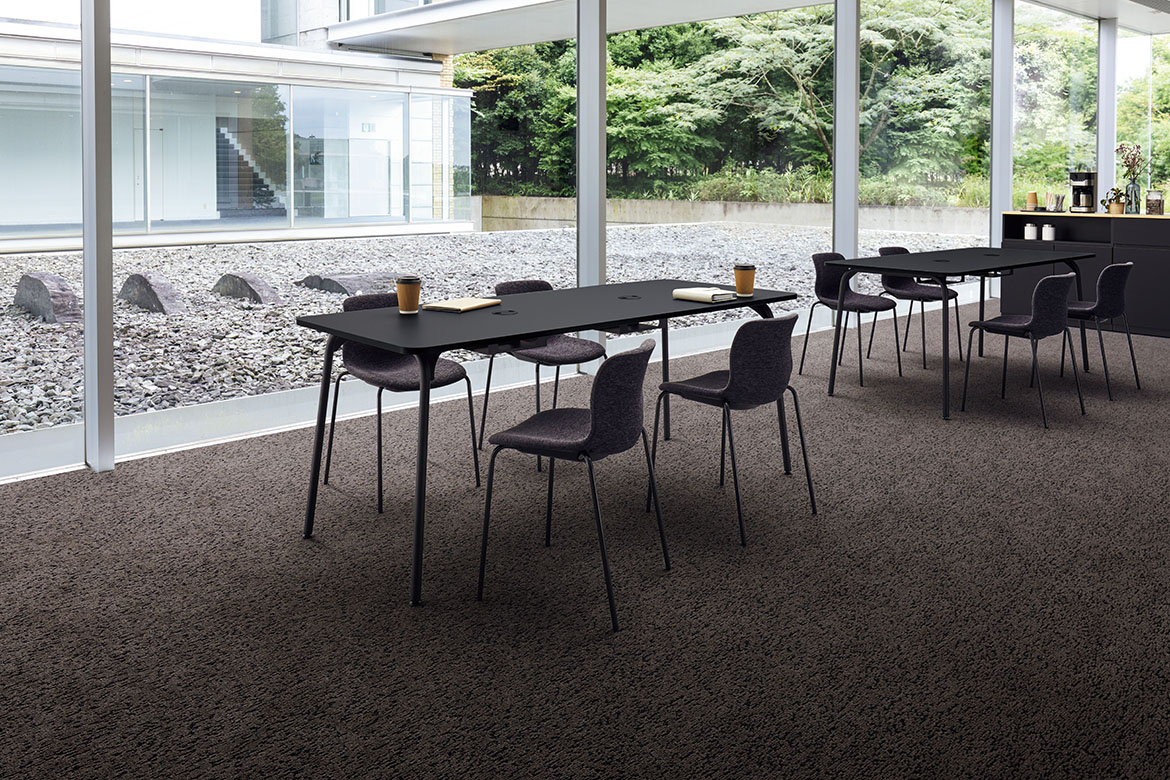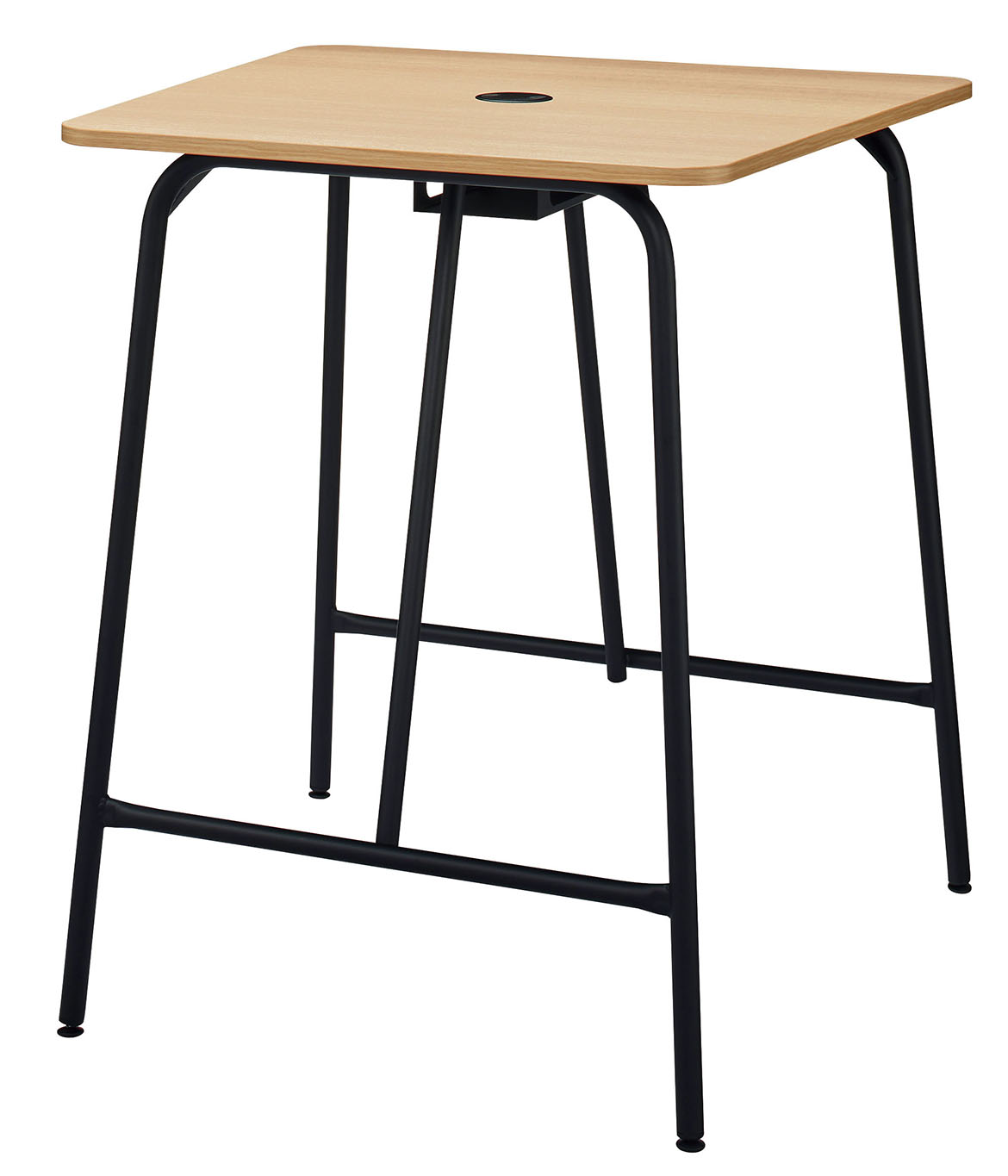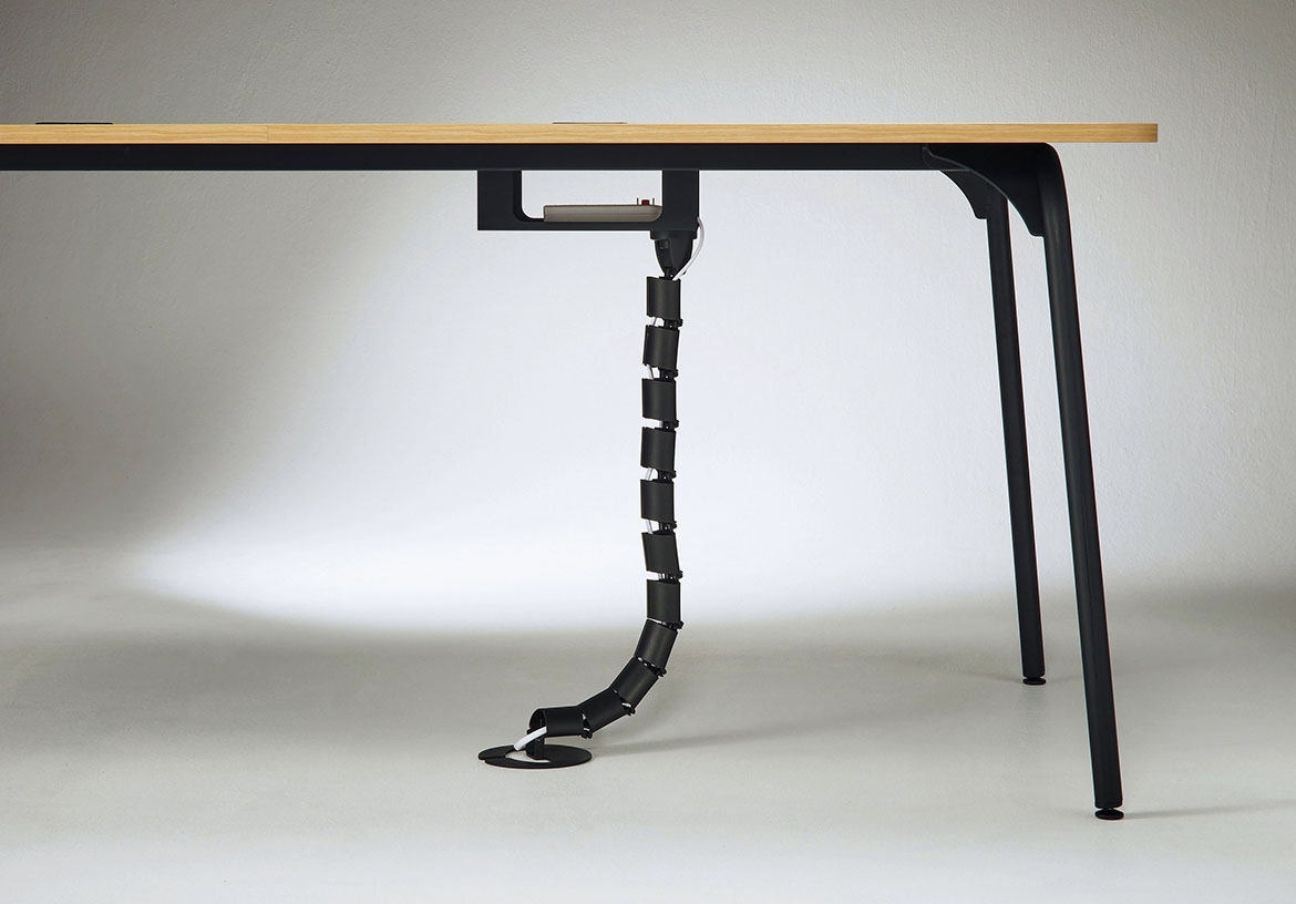 配線孔は、天板を広々と使える小型の円形状。回転するため、どの席からでもアクセスしやすくなっています。