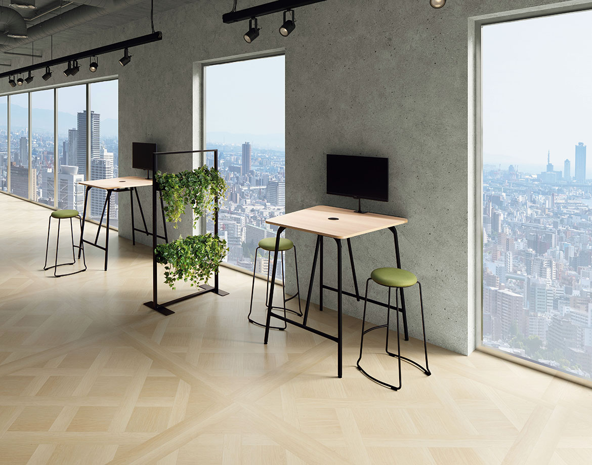 台形天板のビジョン型。少人数でのオンラインミーティングやディスプレイを使用した打ち合わせに適しています。