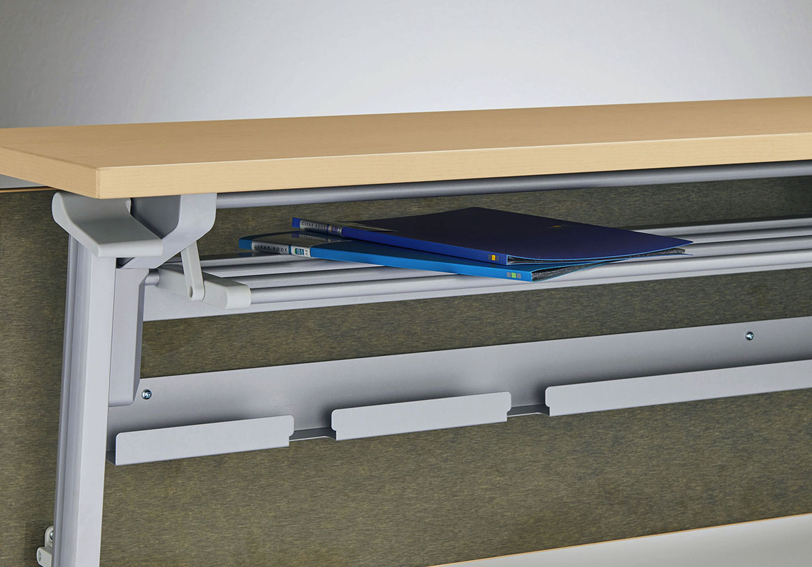 書類やファイルの収納に便利な棚を、天板下に標準装備しています。