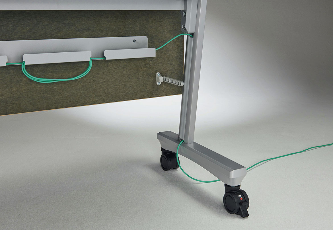 脚支柱の内側にあるカバー付のスリットに配線を通せば、床まですっきりと処理することができ、足元でコードが乱雑になるのを防ぎます。