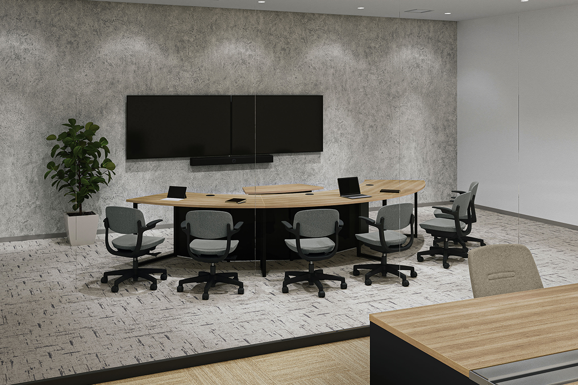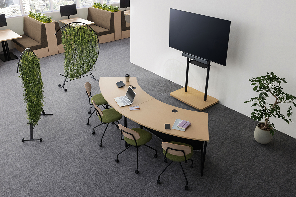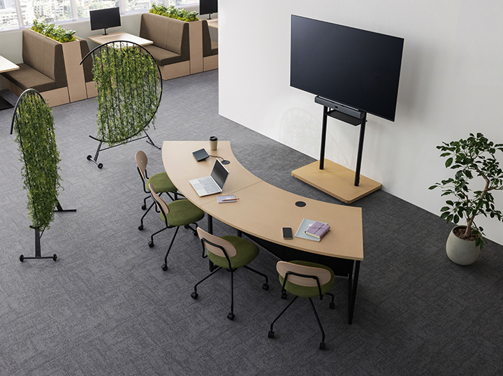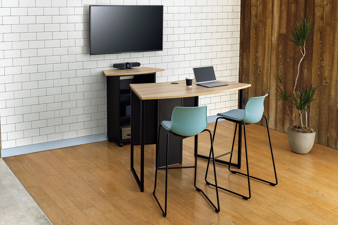 ディスプレイカートと合わせてオープンスペースでミーティング。画面の向こう側とのフランクなコミュニケーションに適しています。