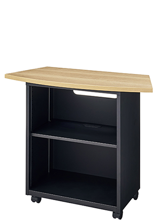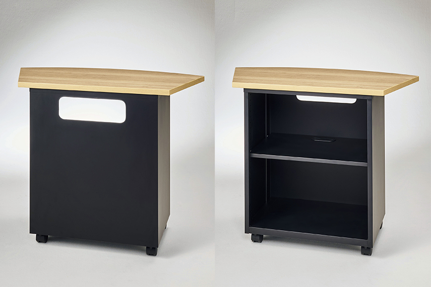 ひとつのカメラに均等に映るよう配慮した天板形状。関連機器を収納するワゴンは、テーブルと同じ高さで内側に合わせて使用することもできます。