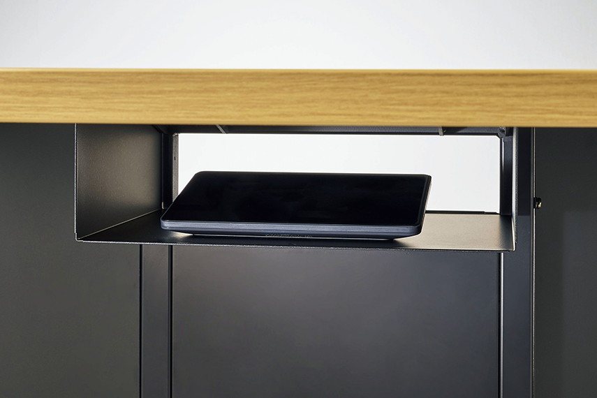 WEB会議デバイス用コントローラやOAタップの収納もできます。
