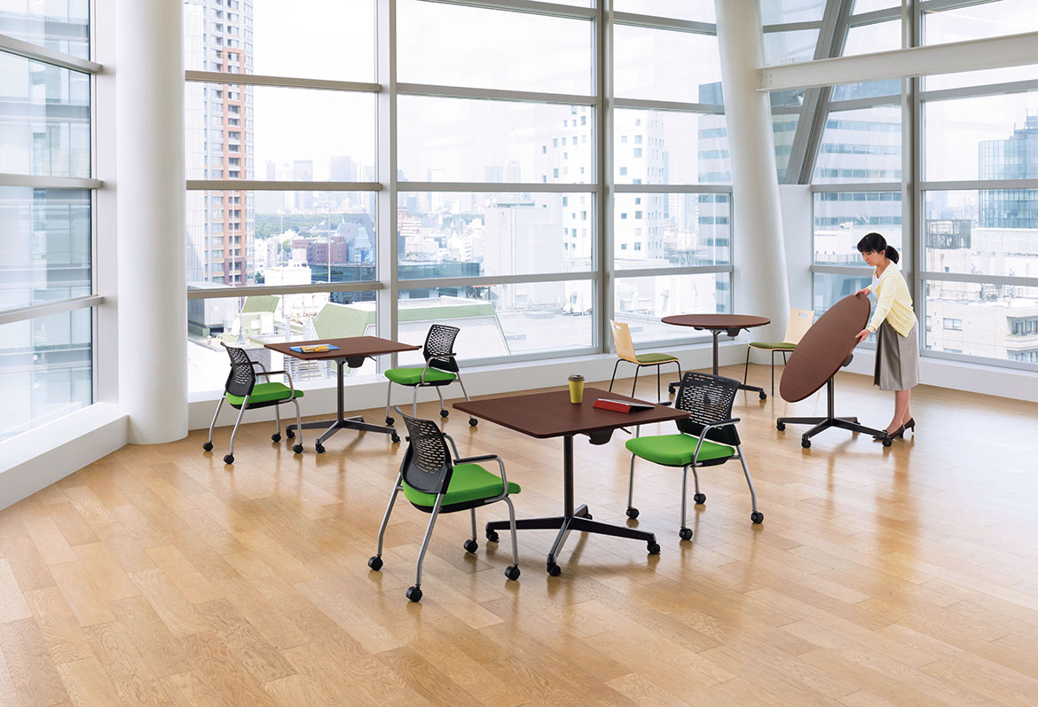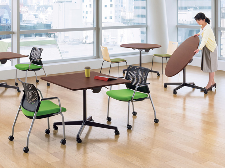 既存のT字脚や十字脚テーブルに比べ省スペース化を実現。