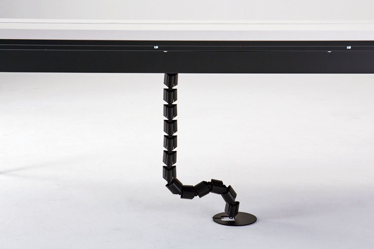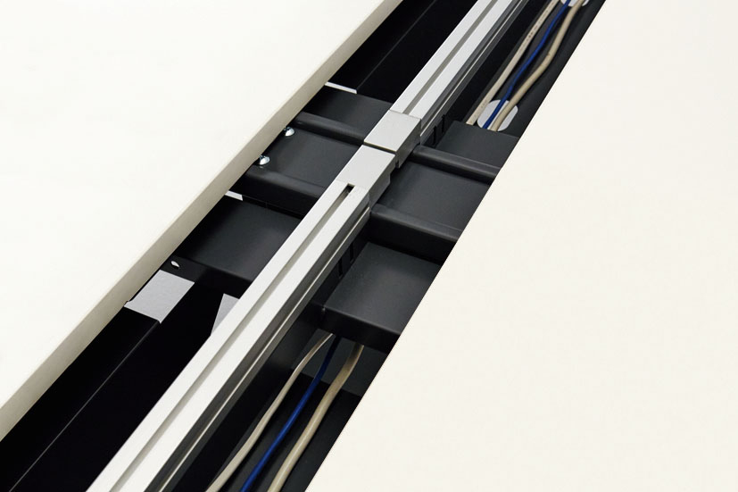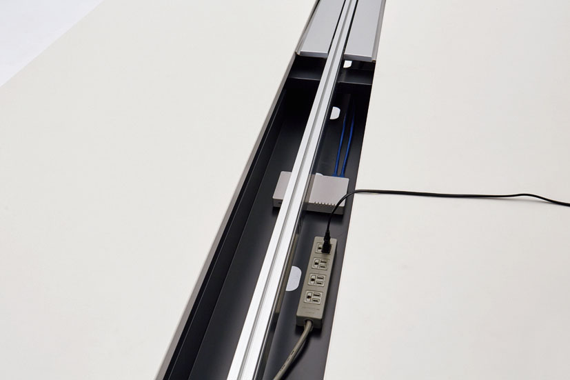 テーブル中央の開閉式配線カバーにより任意の位置で天板からケーブルを落とし込むことがきます。