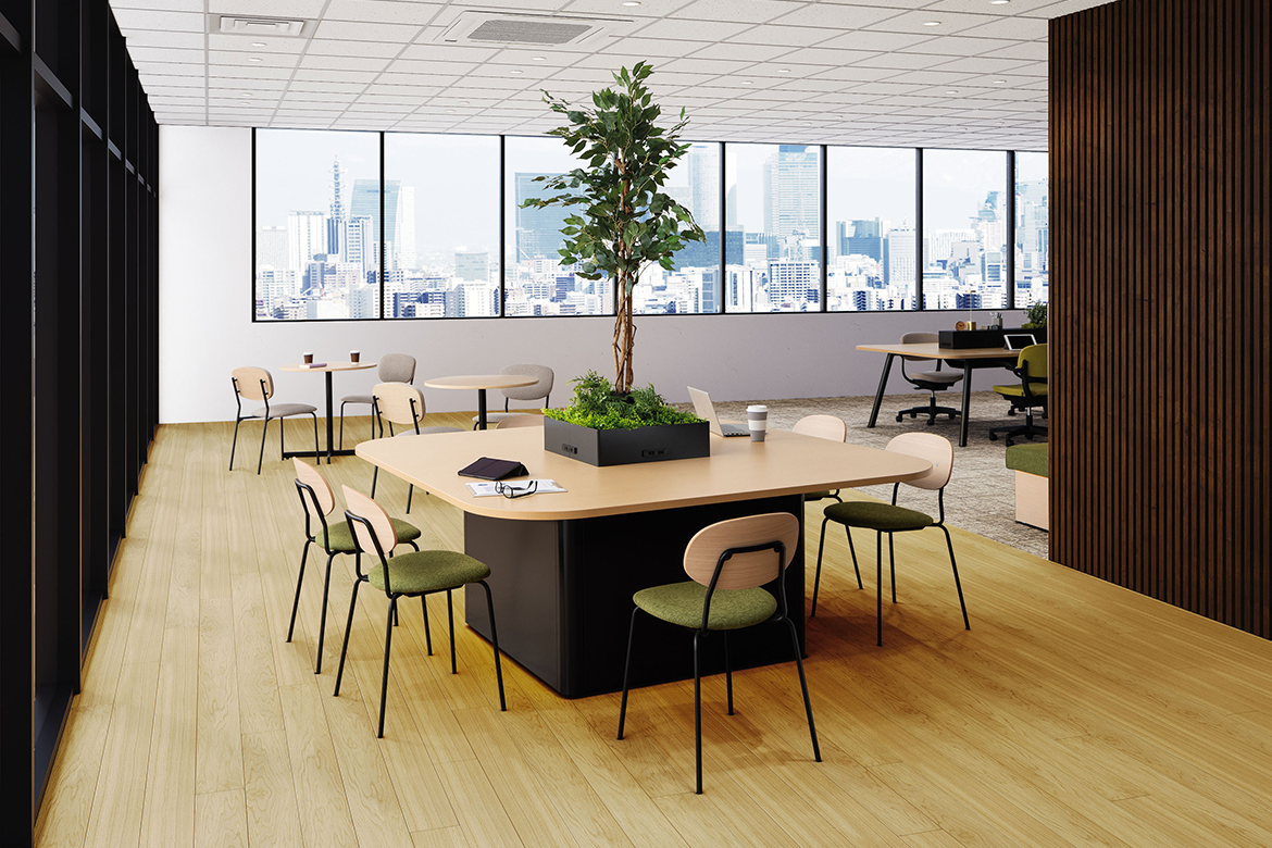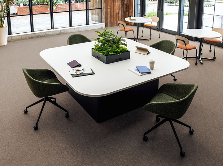 カフェで打ち合わせをする感覚で、リラックスしながらコミュニケーションの活性化を促すことができます。オプションの専用グリーンを設置することでリラックス効果の向上も期待できます。