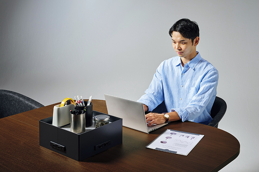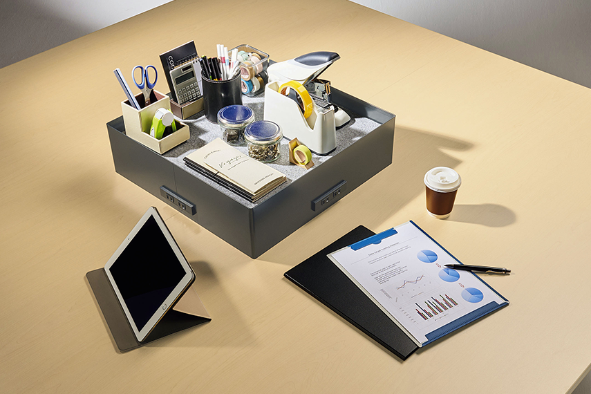 電源コンセントが装備されておりPCやその他のデバイスを快適に使用できます。また机上ボックス上部のトレーに備品を置くことで資料をまとめる等の作業効率も向上します。