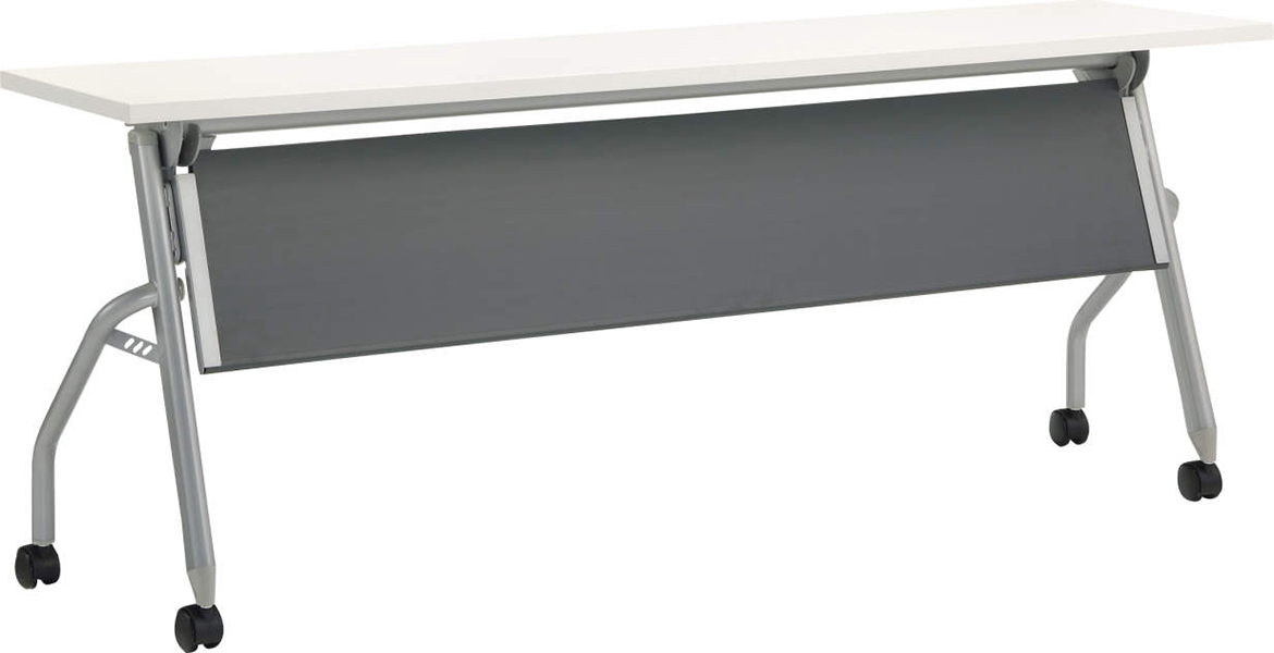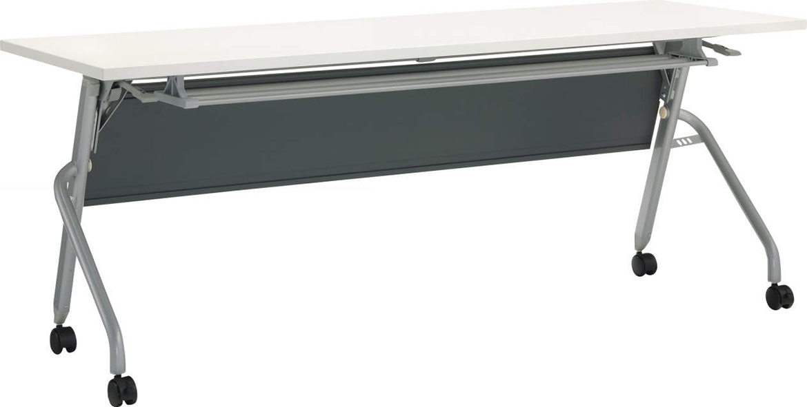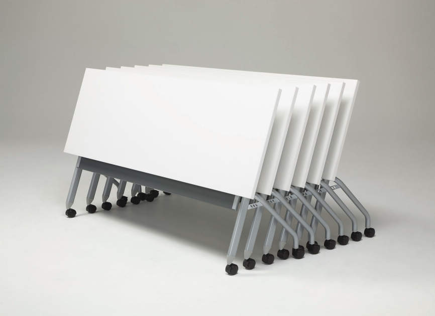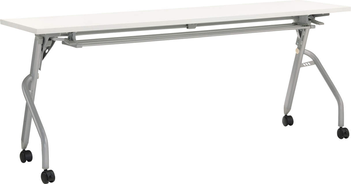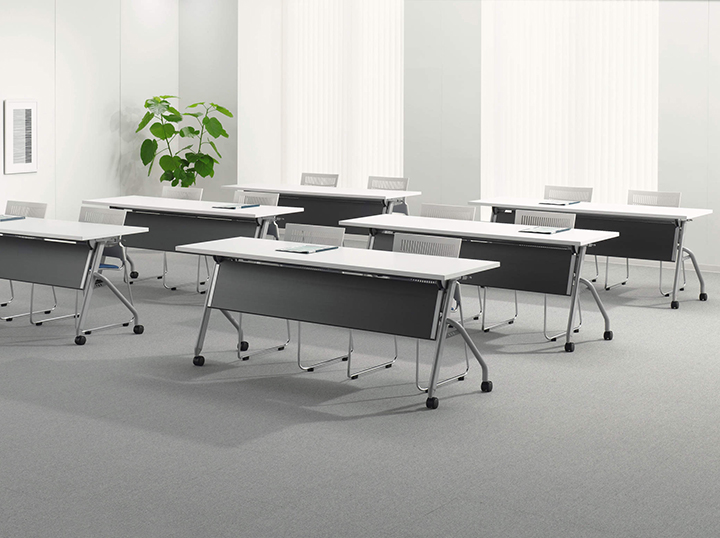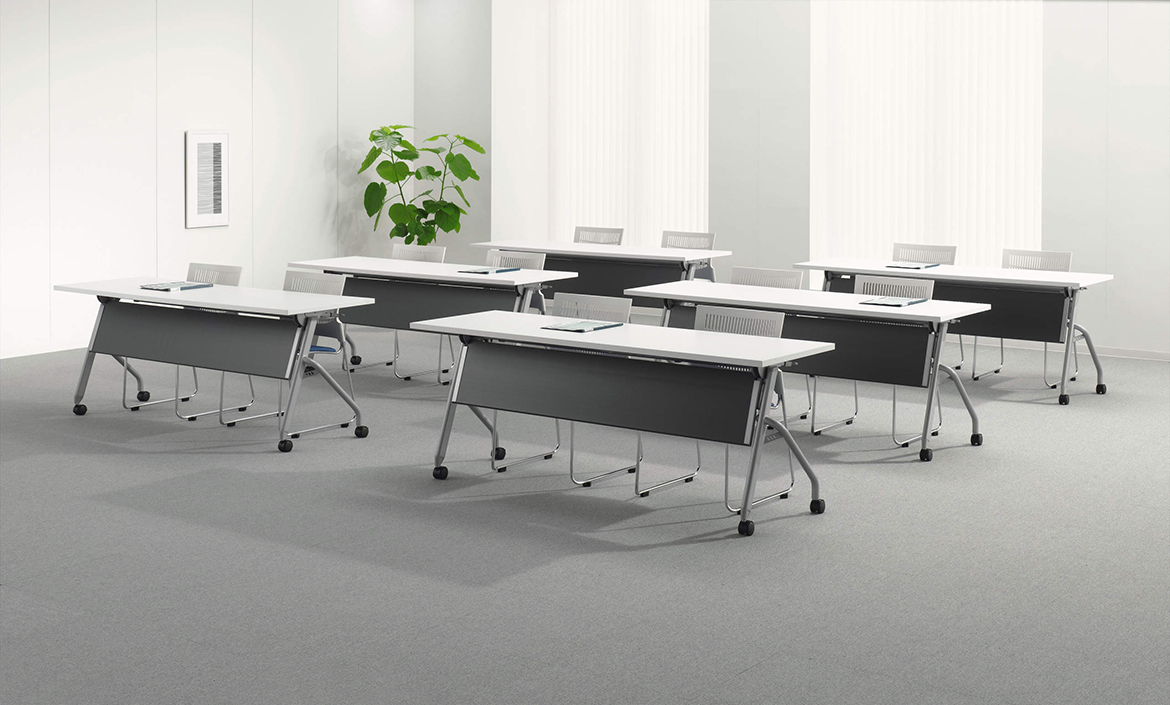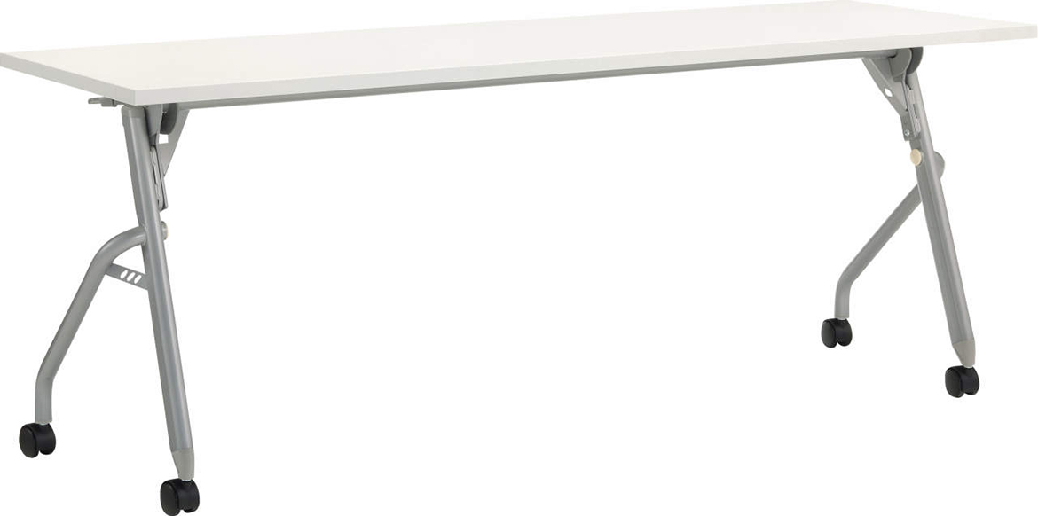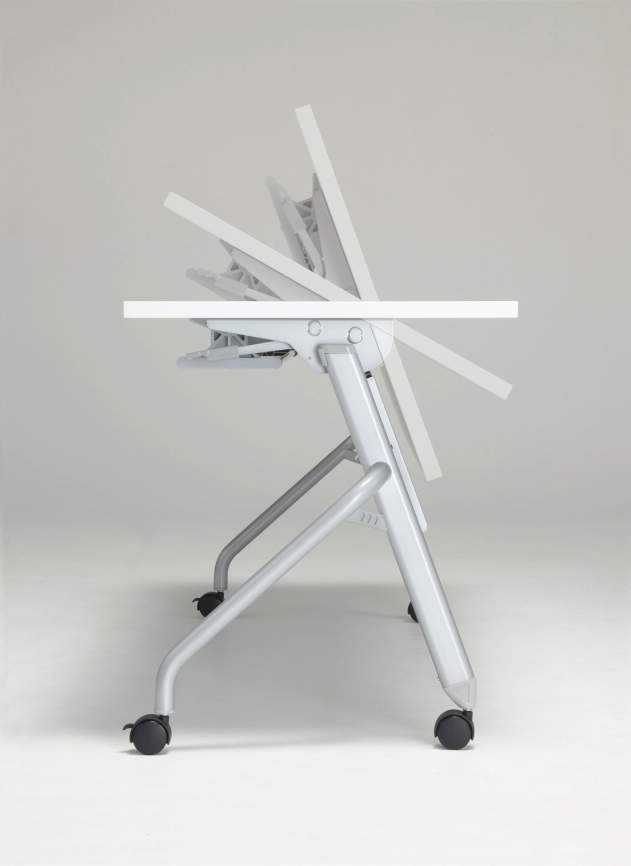 天板を折りたたんで収納する際に斜めにずれず、テーブルの幅で平行に重なる平行スタック式。(※収納スペースご検討の際は、出し入れ作業スペースの確保もご考慮ください)