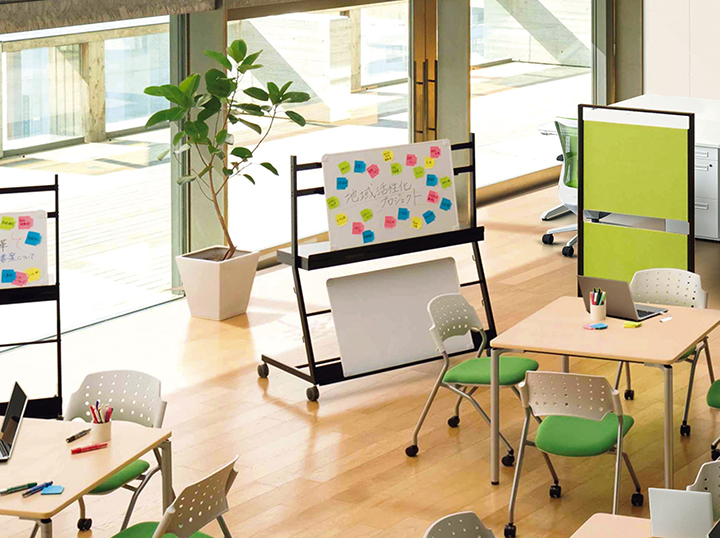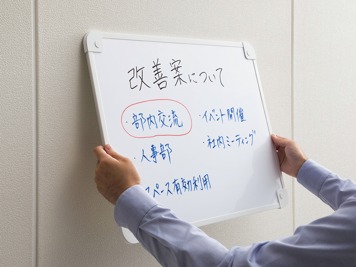 ボードのコーナーにマグネットを装着していますので、スチールパーティションや黒板などに貼りつけることができます。