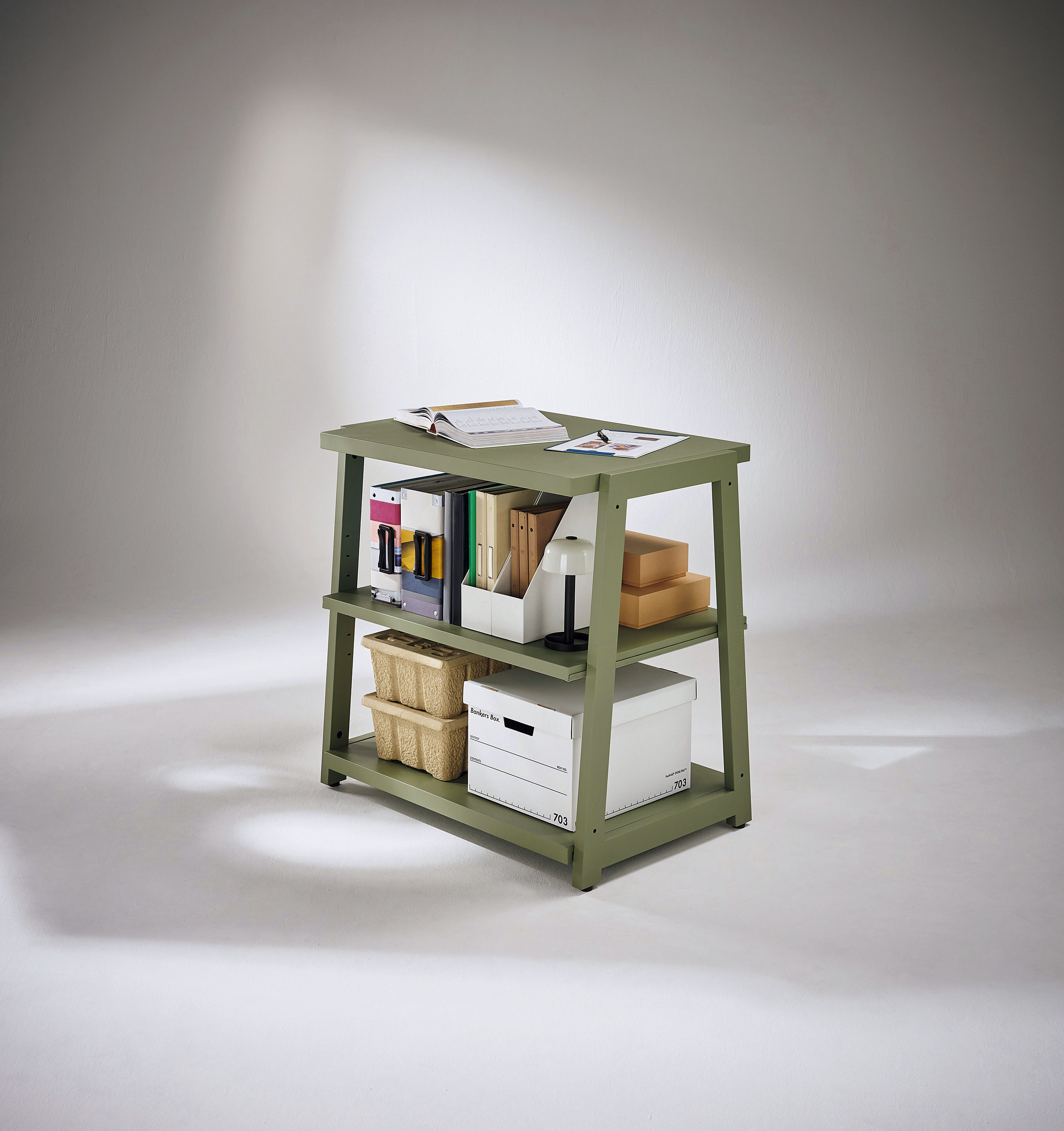 高さ900㎜の2段タイプは収納の機能もありながら、天板を活用しスタンディングでのちょっとした作業に使用できます。