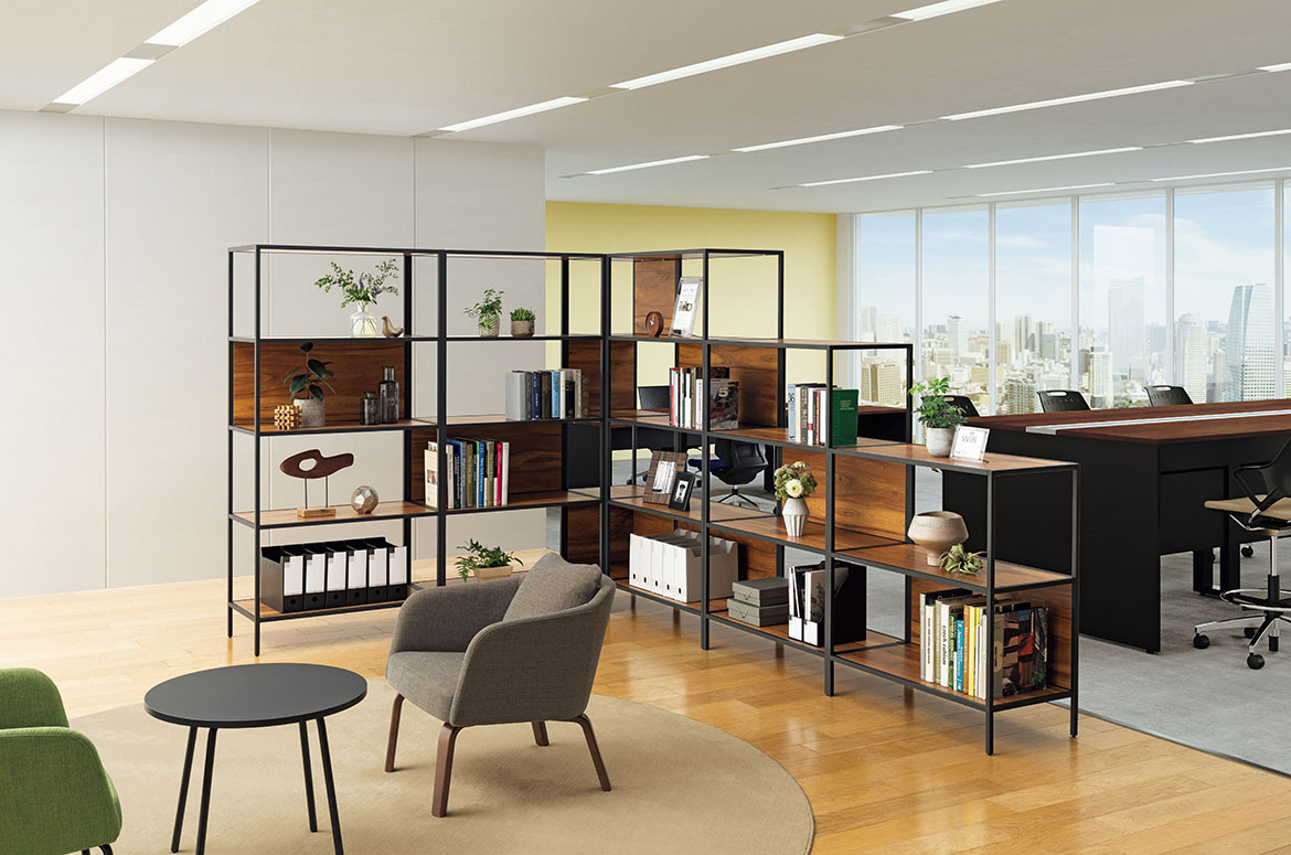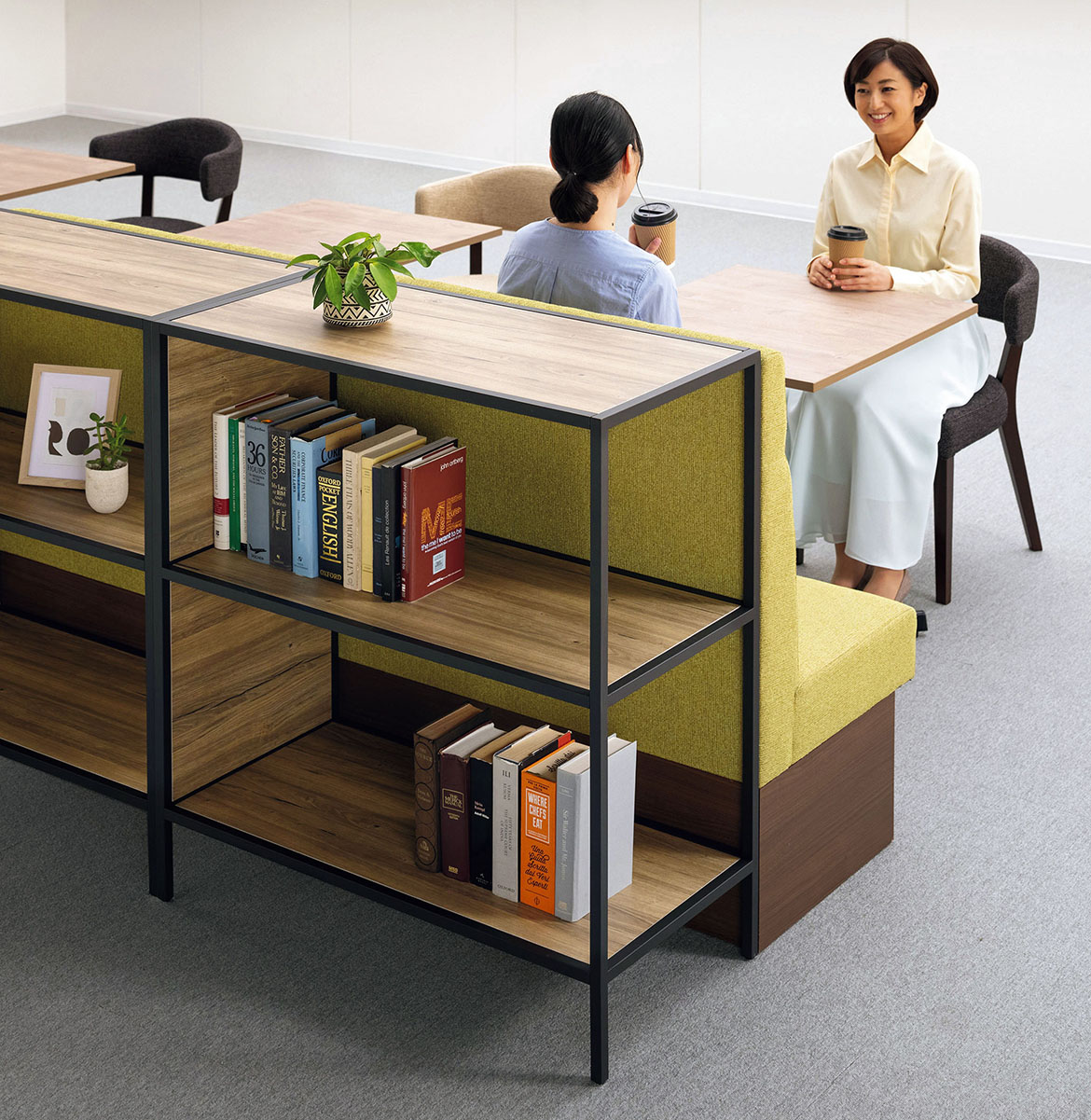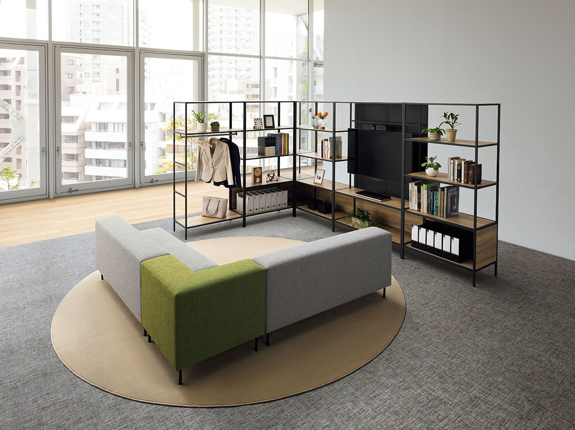 シェルフをL字型に配置して、ゆるやかに囲みちょっとしたミーティング空間を創ることができます。