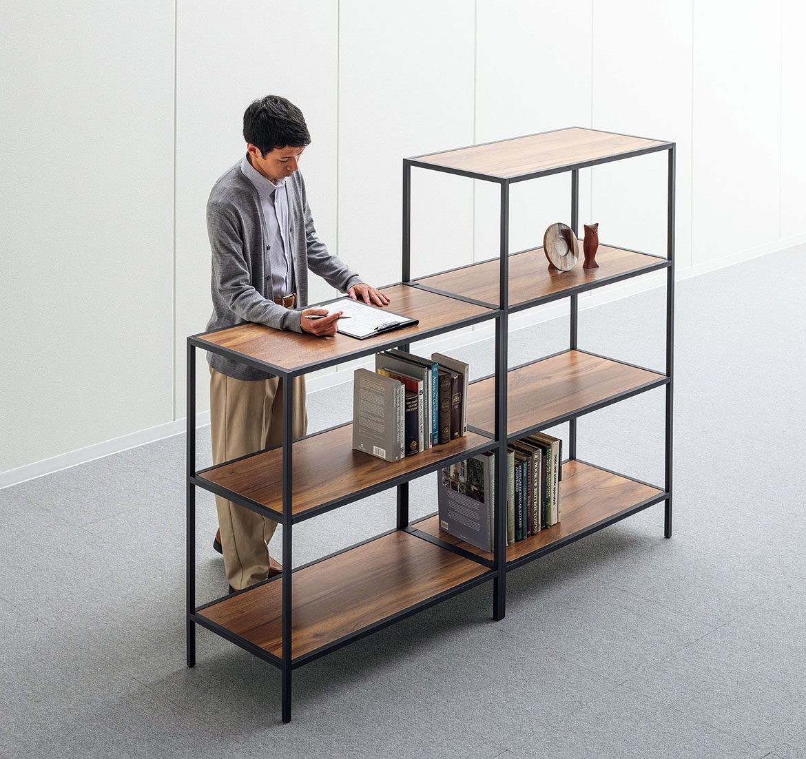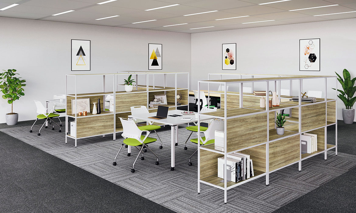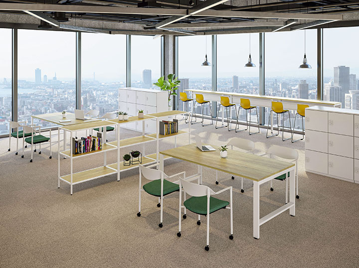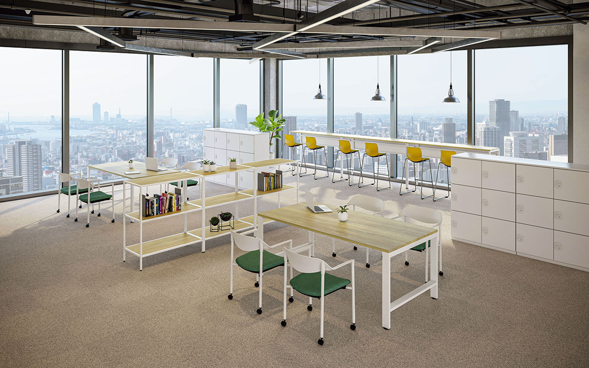 シェルフをL字型に配置して、ゆるやかに囲みちょっとしたミーティング空間を創ることができます。
