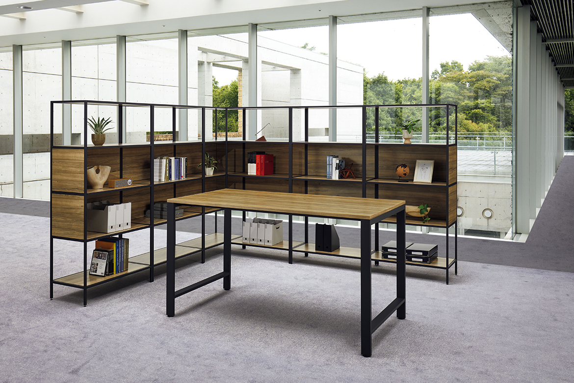 シェルフとテーブルを組み合わせることで、一人での作業やミーティング空間として使用できます。