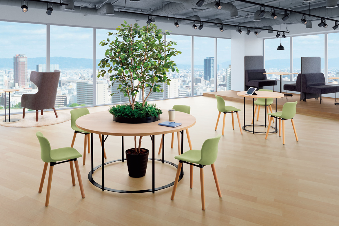 木製脚タイプと木目調のテーブルを合わせて、ナチュラルな雰囲気がもたらす落ち着いた空間に。