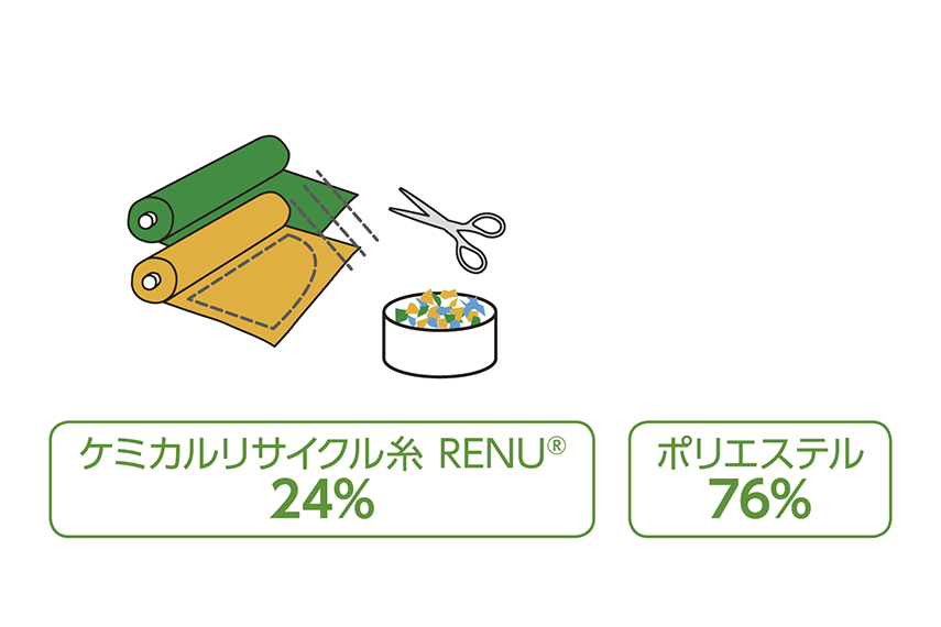 張材は工場から出た端材等を原料としたケミカルリサイクルポリエステル糸RENU®と、ポリエステル糸を使用しています。(「RENU」は伊藤忠商事株式会社の登録商標です。)