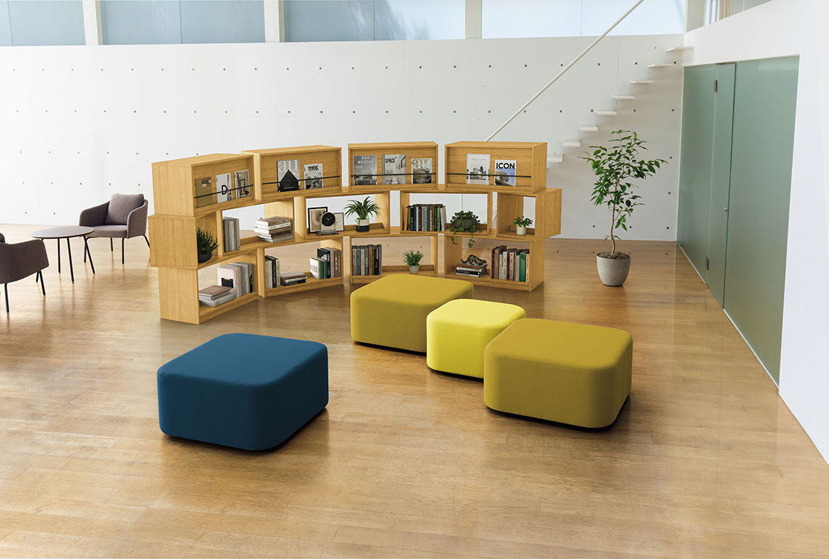 ユニットを組み合わせて「オフィスのライブラリー空間」を演出するユニットシェルフ。働く場の選択肢が広がった現在センターオフィスの役割が重要視されています。自宅にはない参考資料を見て思考を巡らせたり、偶発的なコミュニケーションを生み出す交流の場をご提案いたします。