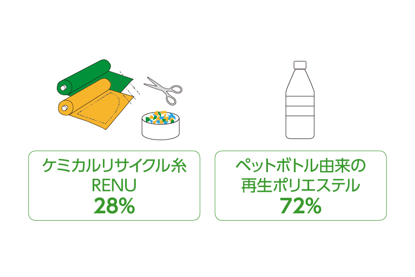 布張りFタイプは、工場から出た端材等を原料としたケミカルリサイクルポリエステル糸RENUと、回収したペットボトルを原料にした再生ポリエステル糸を使用しています。(「RENU」は伊藤忠商事株式会社の登録商標です。)