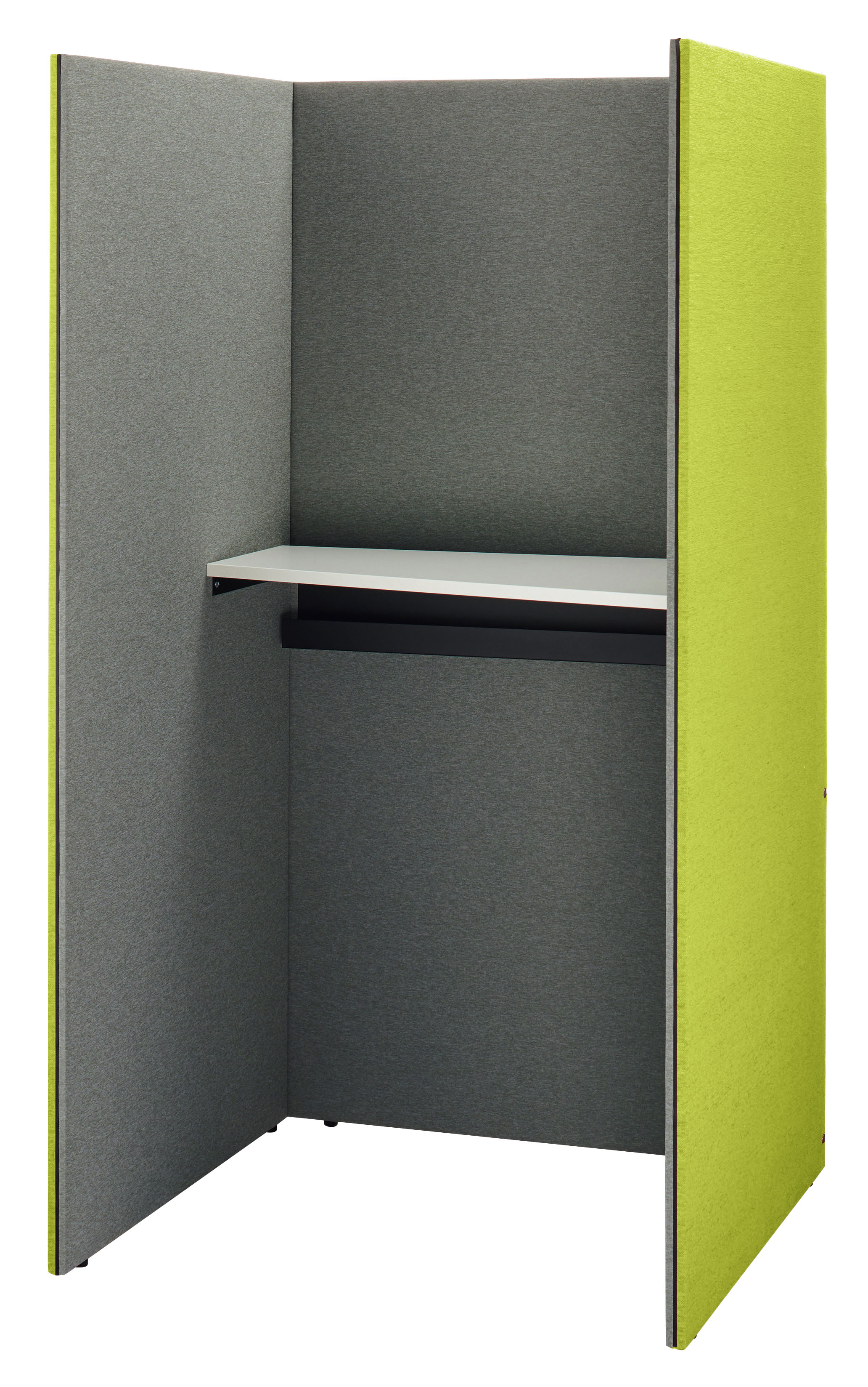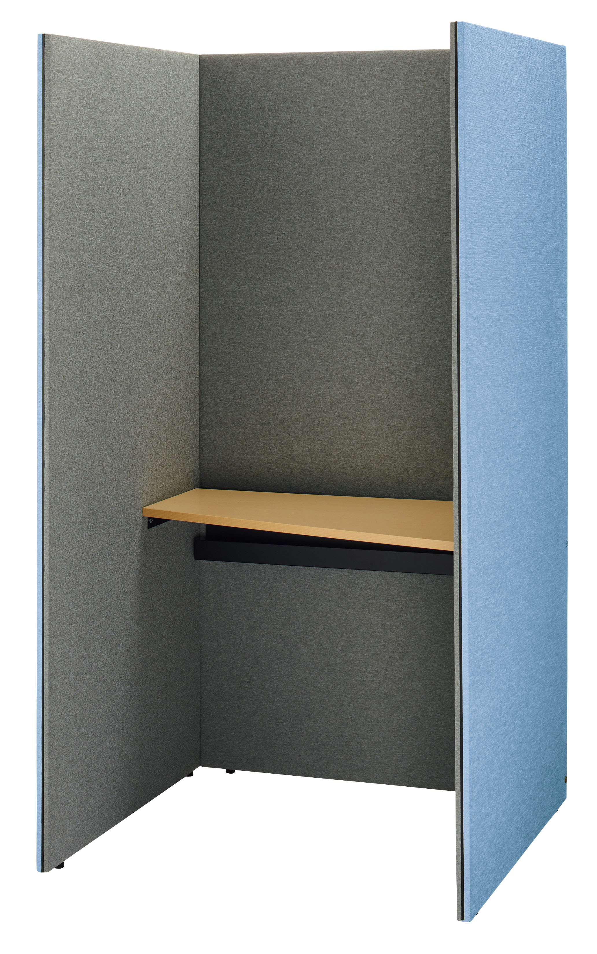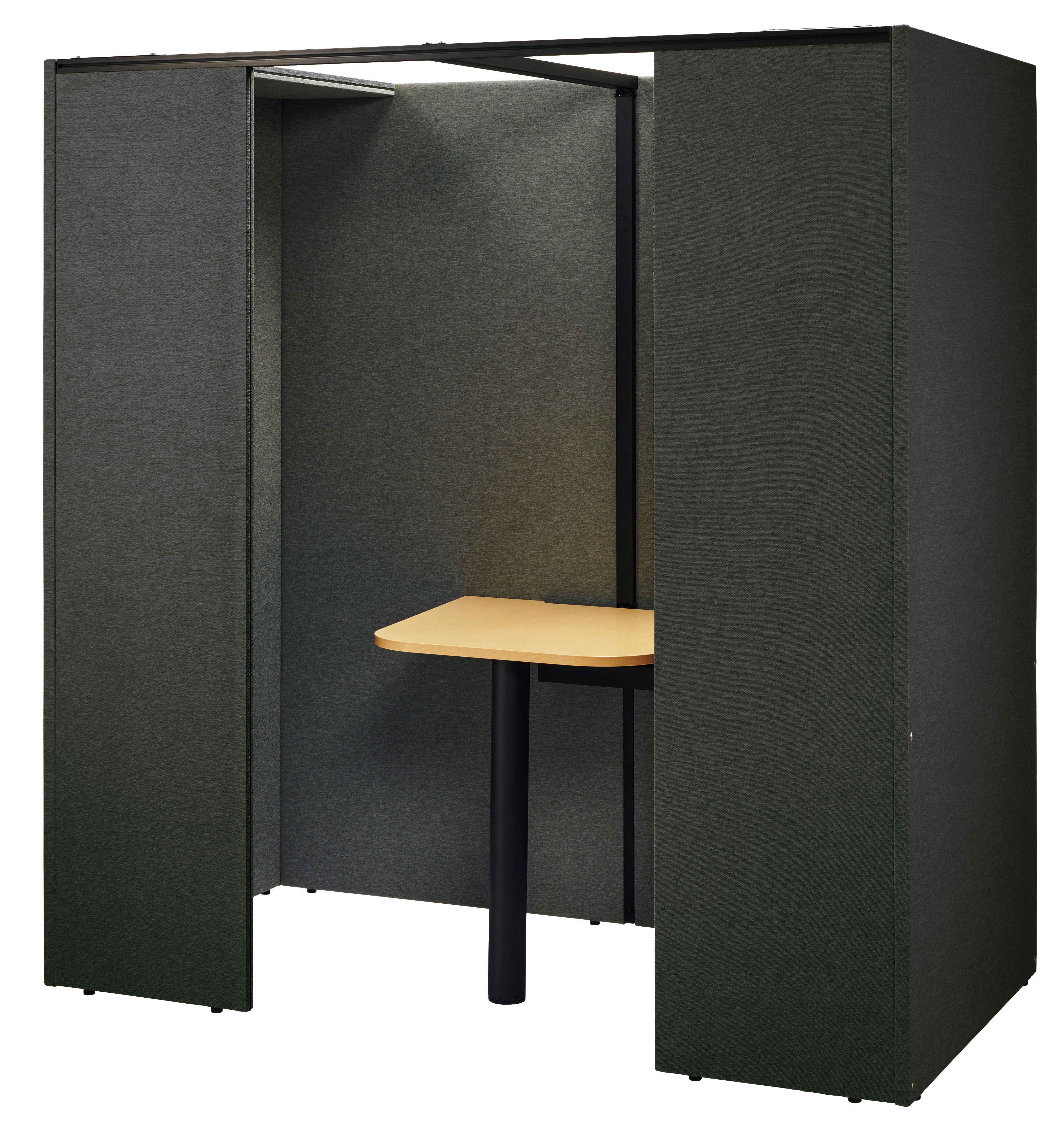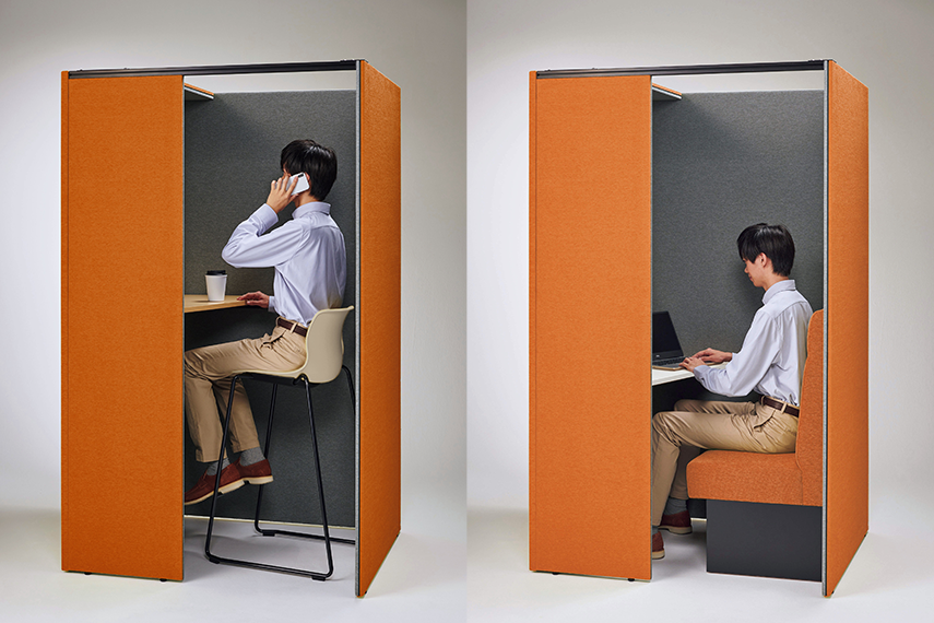天板付きの1人用は天板の高さを2種類(H1000㎜・H720㎜)ラインアップ。ハイポジション・ローポジションに対応し、テレフォンブース、集中作業やWebミーティング用ブース、タッチダウンブースとしてご活用いただけます。