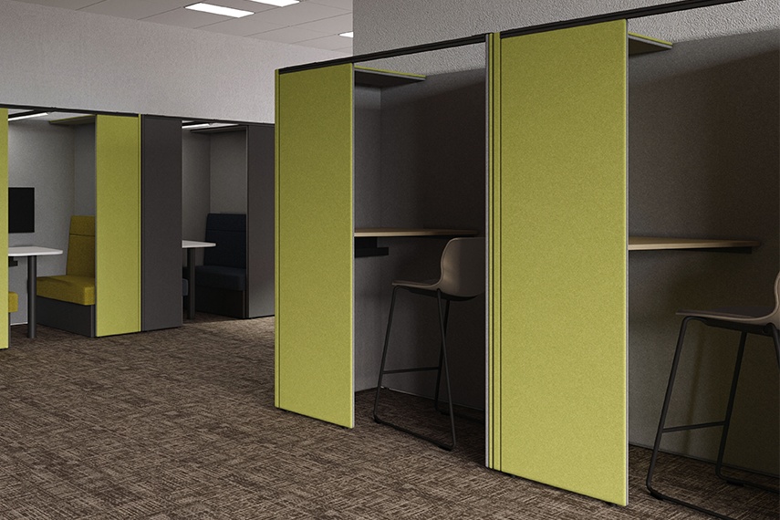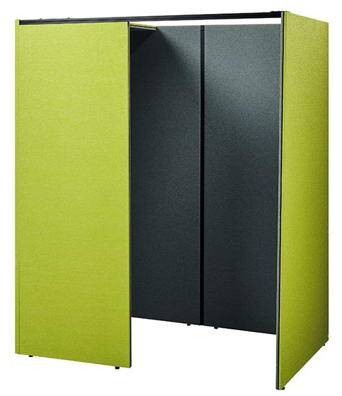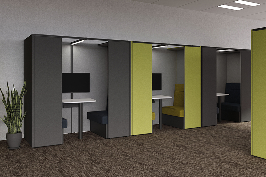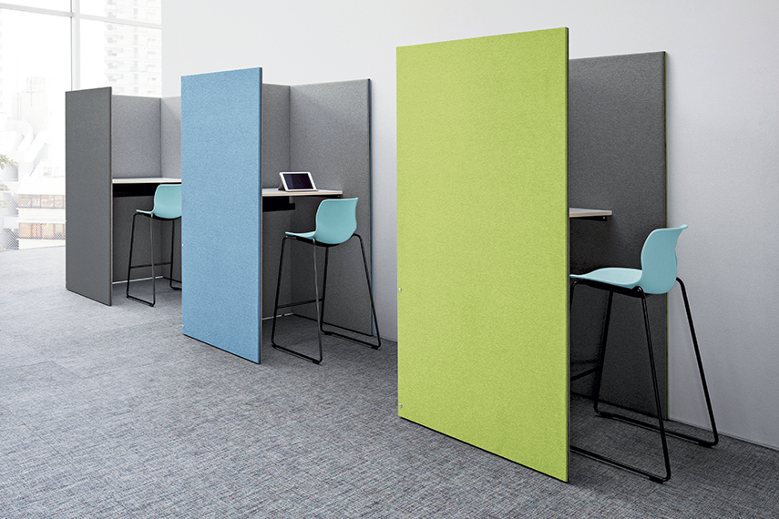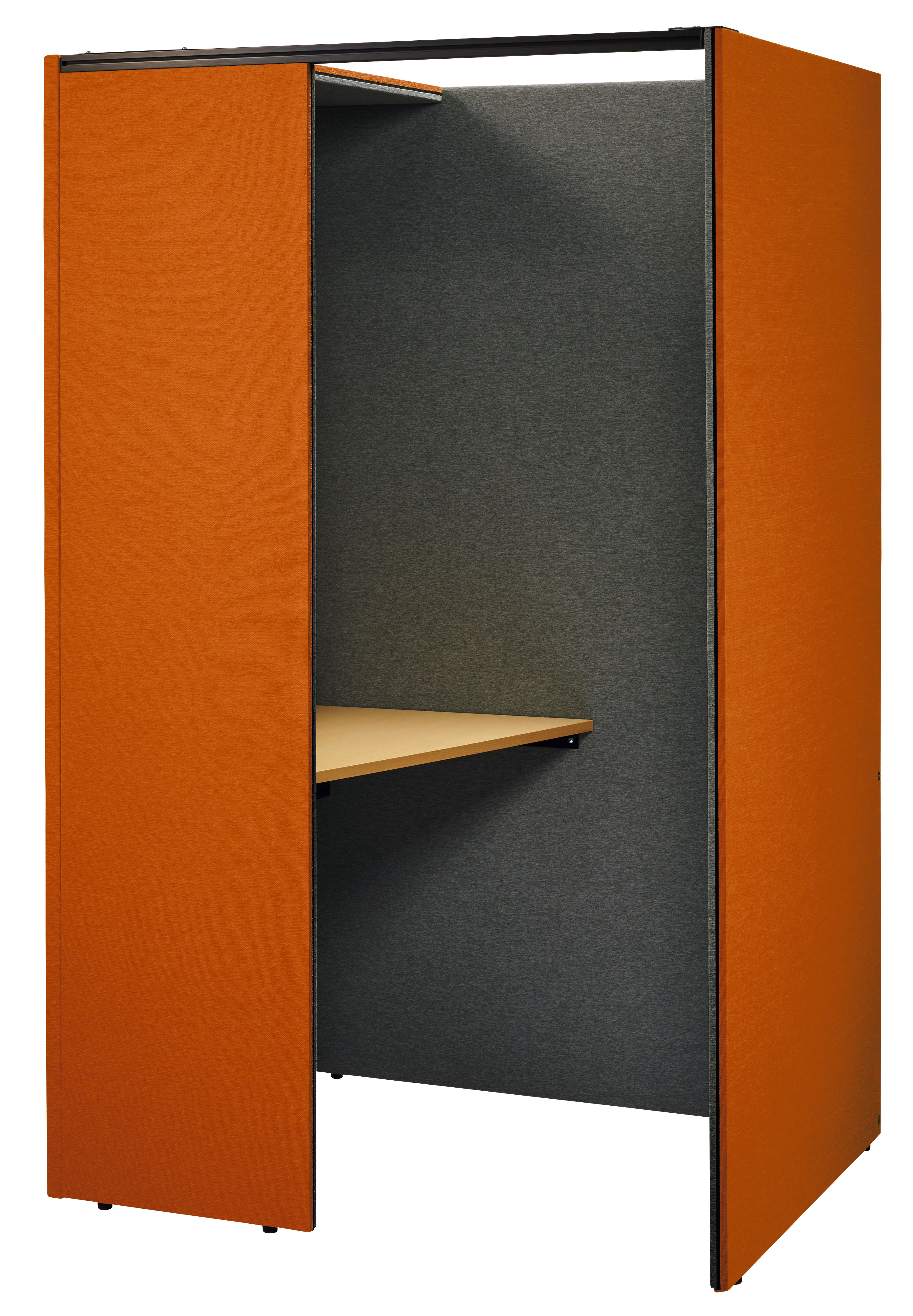 天板付きの1人用は天板の高さを2種類(H1000㎜・H720㎜)ラインアップ。ハイポジション・ローポジションに対応し、テレフォンブース、集中作業やWebミーティング用ブース、タッチダウンブースとしてご活用いただけます。