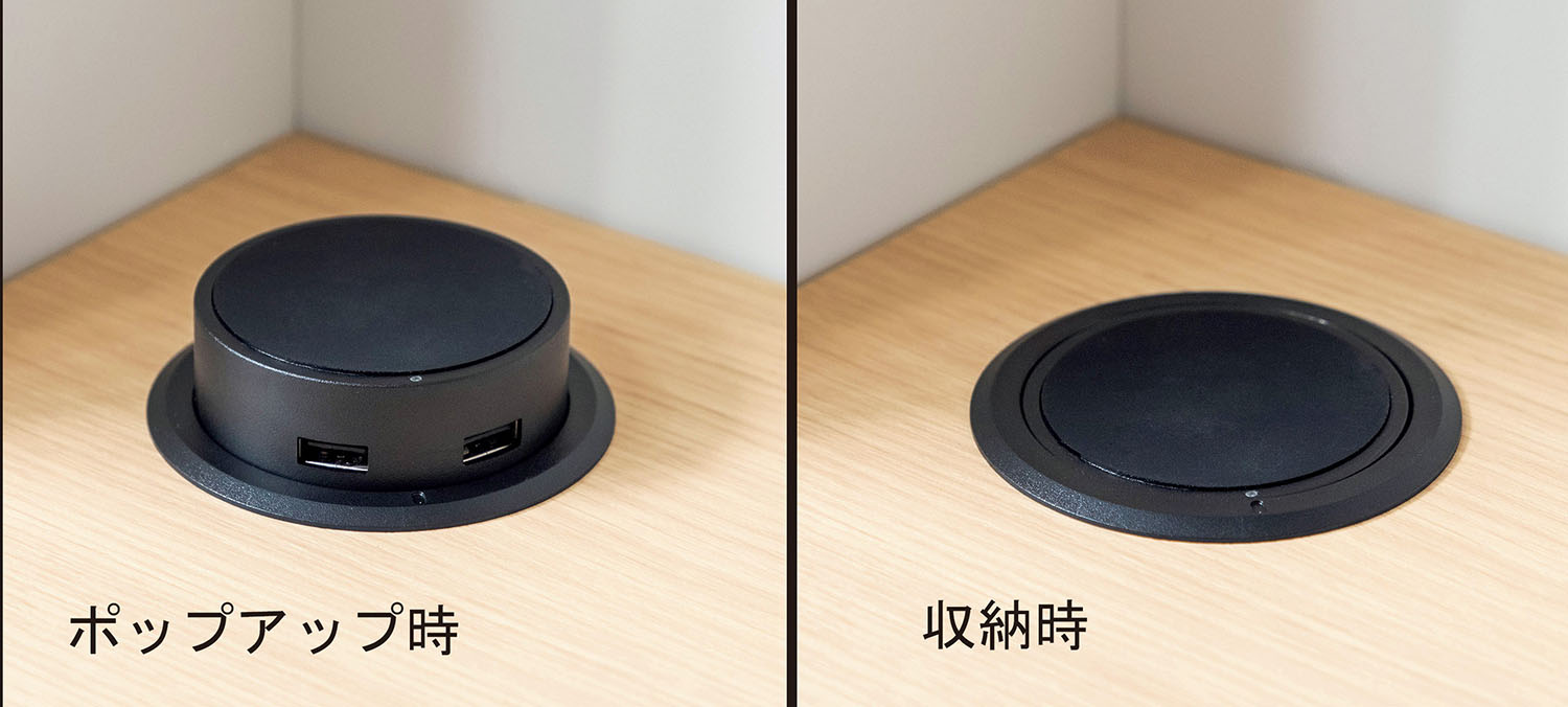 対応するスマートフォンを置くだけで充電できるワイヤレス充電器〔Qi(チー)〕(最大10W)。ポップアップ時は、USB 2口コンセント(最大10W)も使用できます。