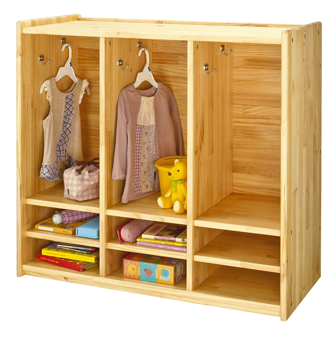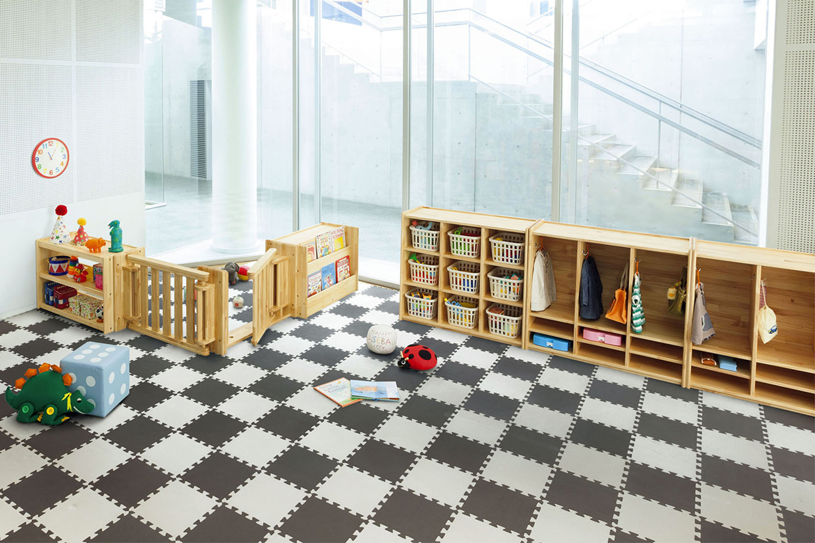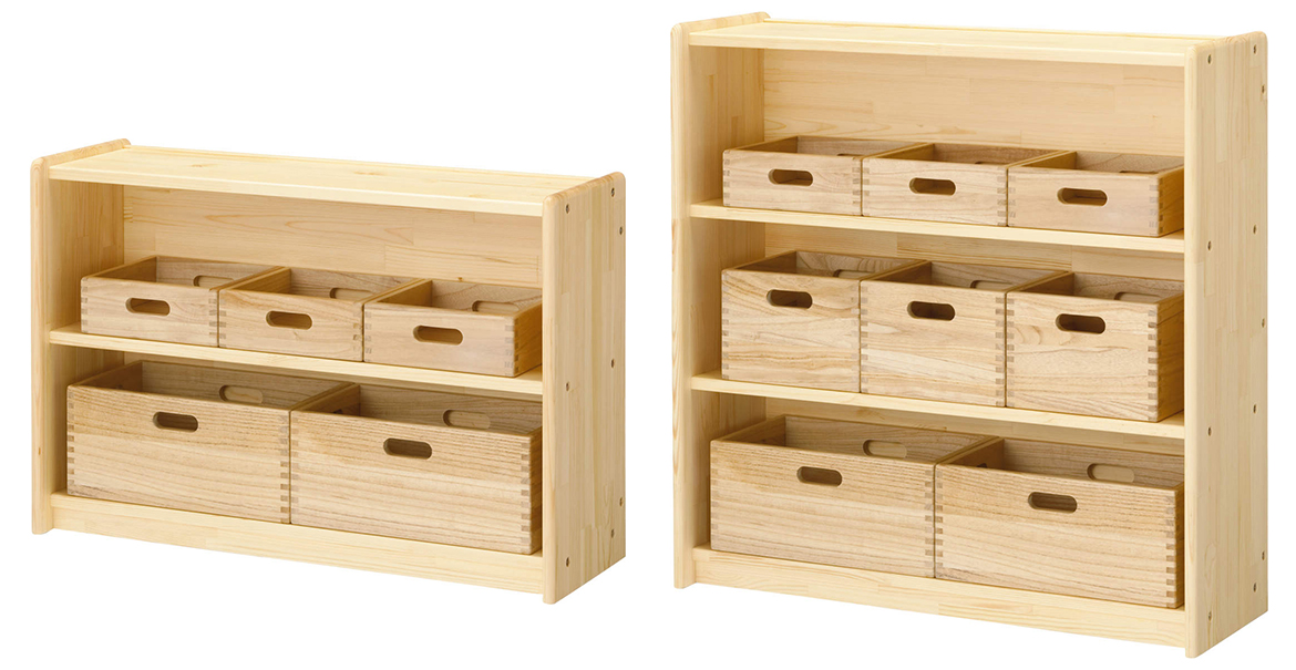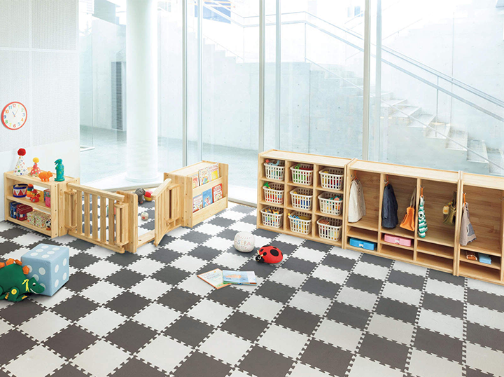 小規模の保育施設に適したロッカーと整理棚です。パーティションは専用の整理棚と組み合わせて空間仕切りとして使用できます。