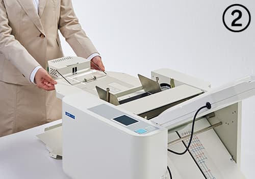使用方法は、エアーさばきユニットを紙折機本体の給紙テーブルに装着し (図 ① ②)送風ボタンを押す(図 ③ )だけです。あとは通常の紙折機の操作と同様なので、どなたでも簡単にご使用いただけます。