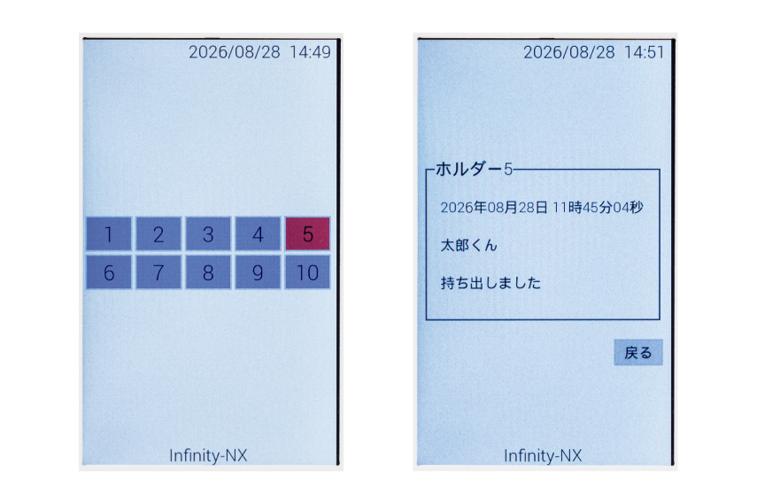 見やすい5インチ液晶タッチパネルで、鍵を誰がいつ持ち出したのか・返却したのかなどの状況の確認が可能です。貸出し中のボタン(赤)をタッチすると、直前に持ち出した人の情報を表示します。