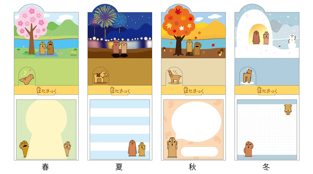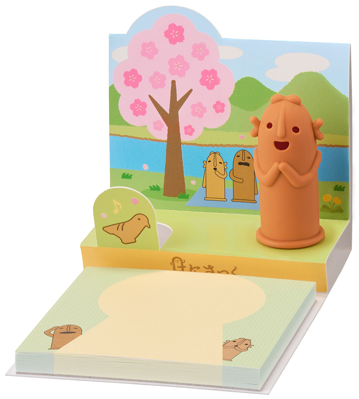 <はにさっく 其の参>の発売を記念したアイテムを数量限定で発売いたします。台紙を組み立てると、春夏秋冬をイメージした景色と、はにさっくを飾れるステージが現れるポップアップ式のメモです。メモは同柄50枚入りで、メッセージを書き込みやすいデザインです。